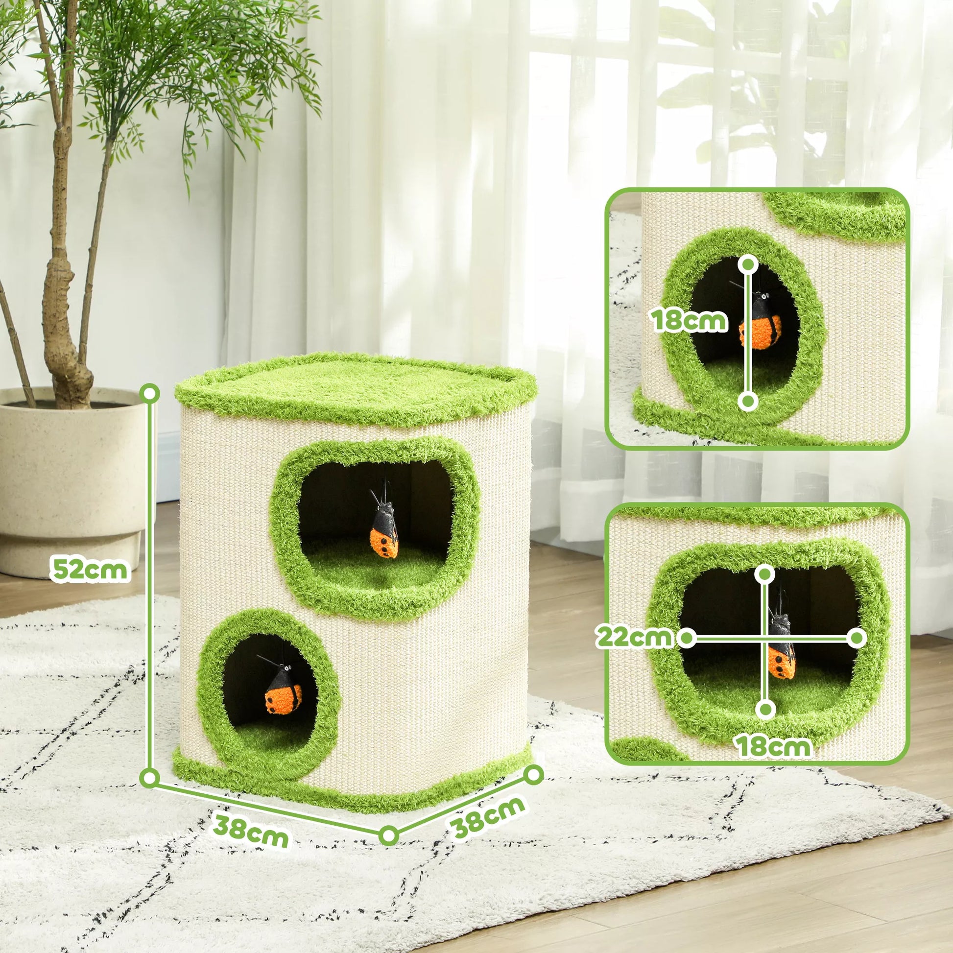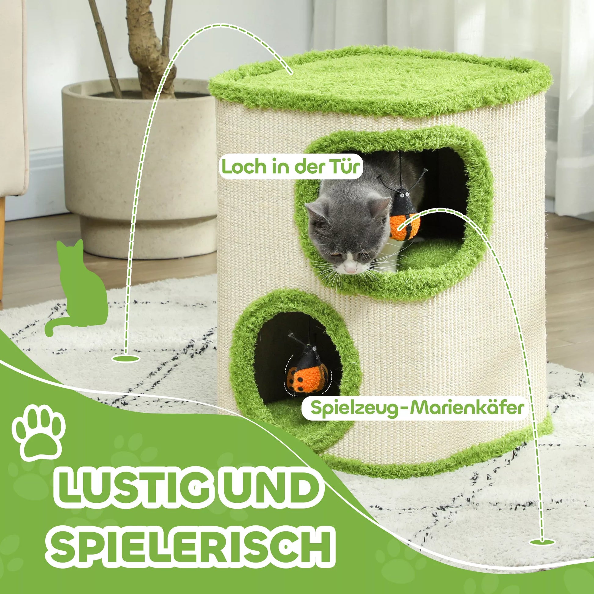 Laisva vieta -katės draskyklei – draskymo ir miego rojus dviejose pakopose, kviečiantis tiek ramiam snaudimui, tiek aktyviam žaidimui. Apsupta sizalio sluoksniu, katės draskymo statinė idealiai tinka nagams aštrinti, o minkštas pliušinis pamušalas suteikia jūsų katei jaukų patogumą. Du cypsiantys boružėlės formos žaislai ant draskymo bokšto suteikia papildomų linksmybių ir pramogų. Žavinga poilsio vieta, kuri pradžiugins kiekvieno namų tigro širdį!