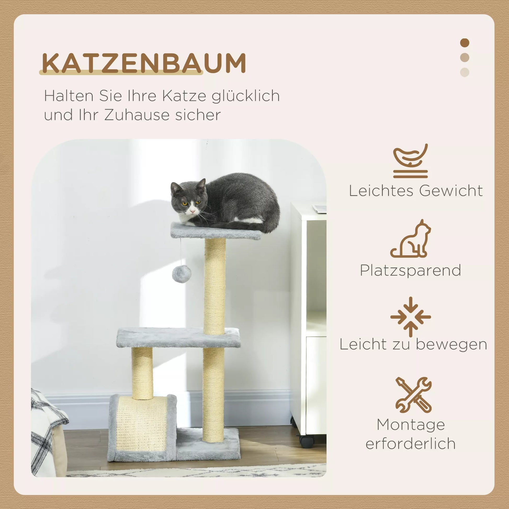 Katino medis 72 cm, katės bokštas su pliušiniais kamuoliukais, sizaliniais stiebais, platforma, draskykle, šviesiai pilkas