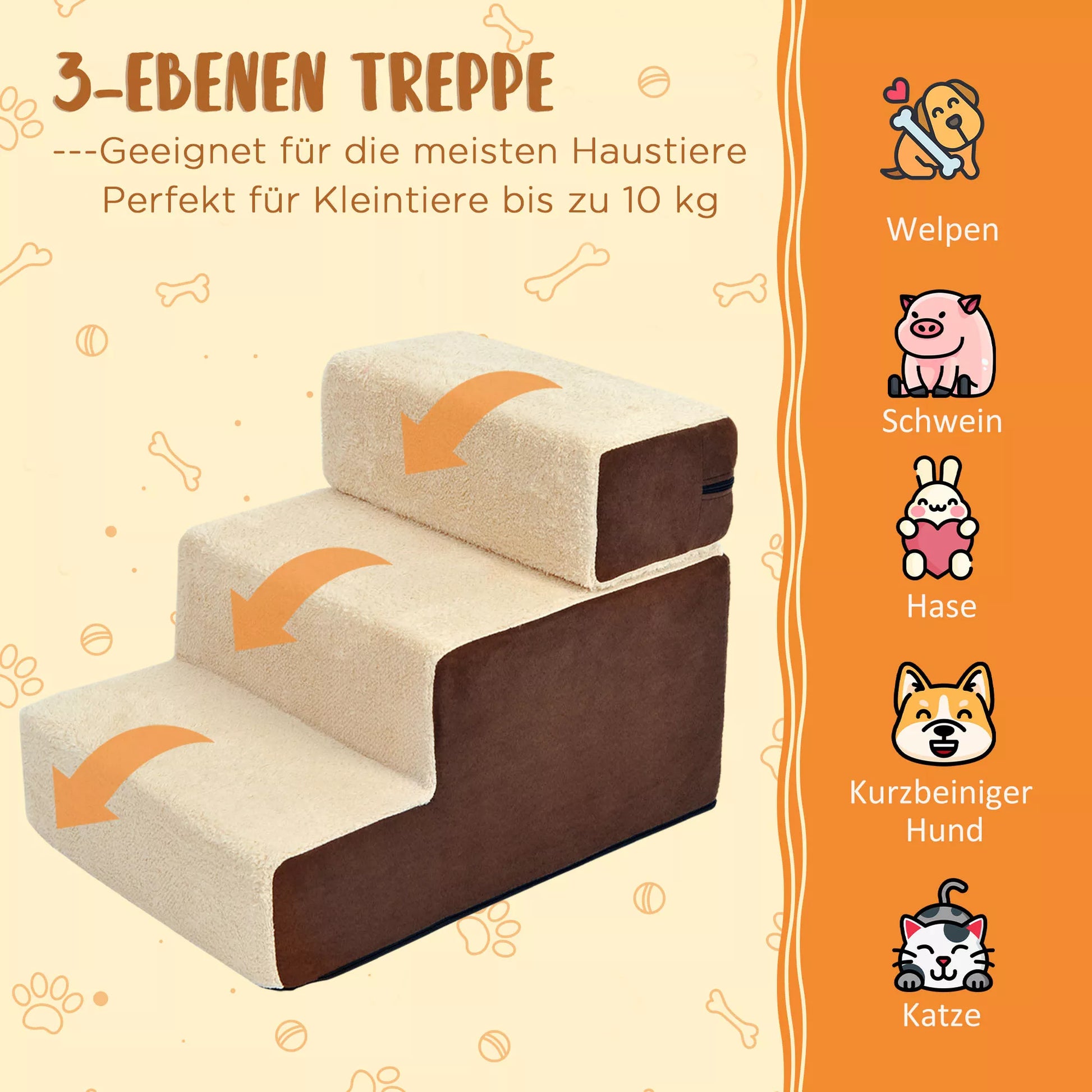 Laiptukai augintiniams, 3 pakopų šunų ir kačių laiptukai, pliušiniai, smėlio spalvos, 54 x 40 x 39cm