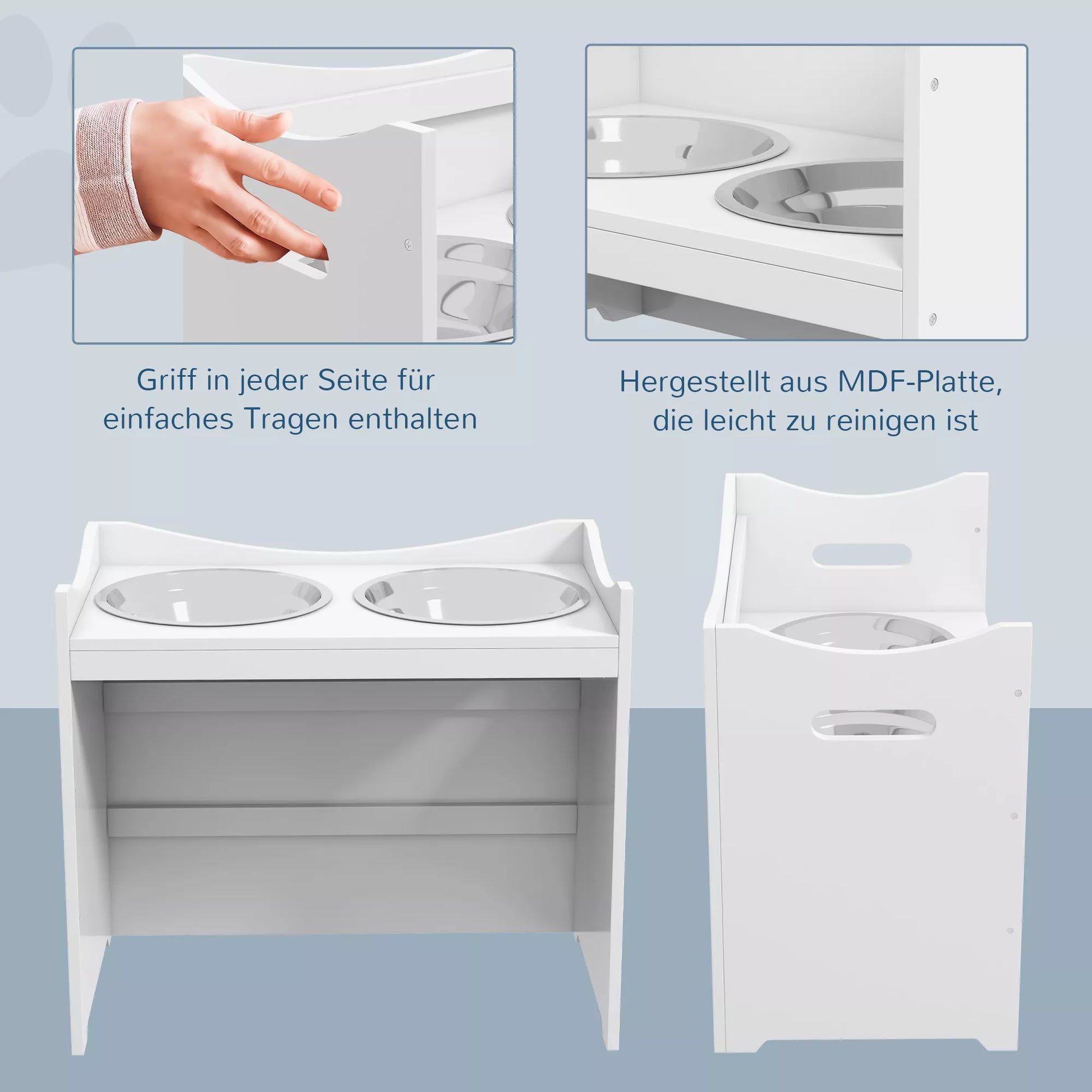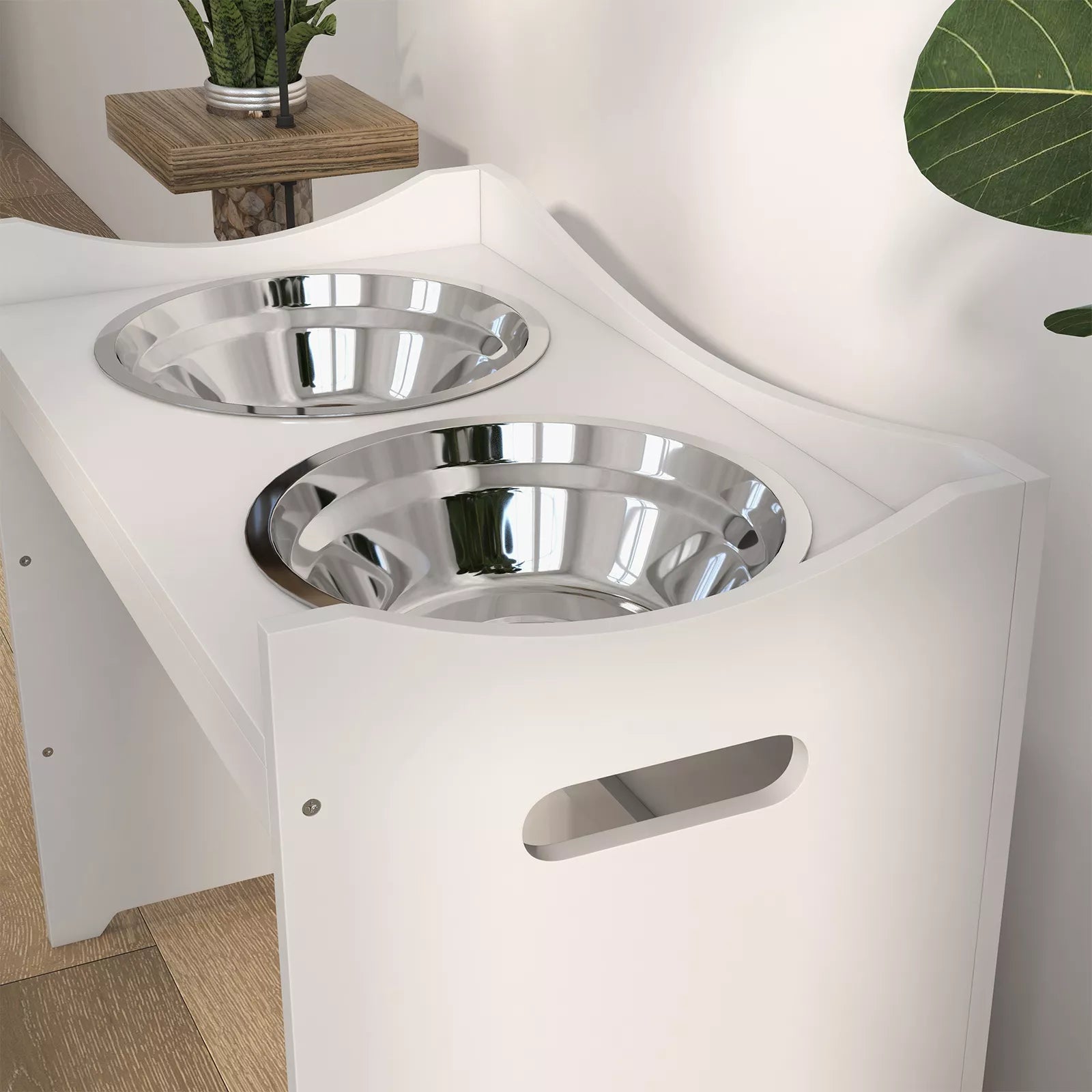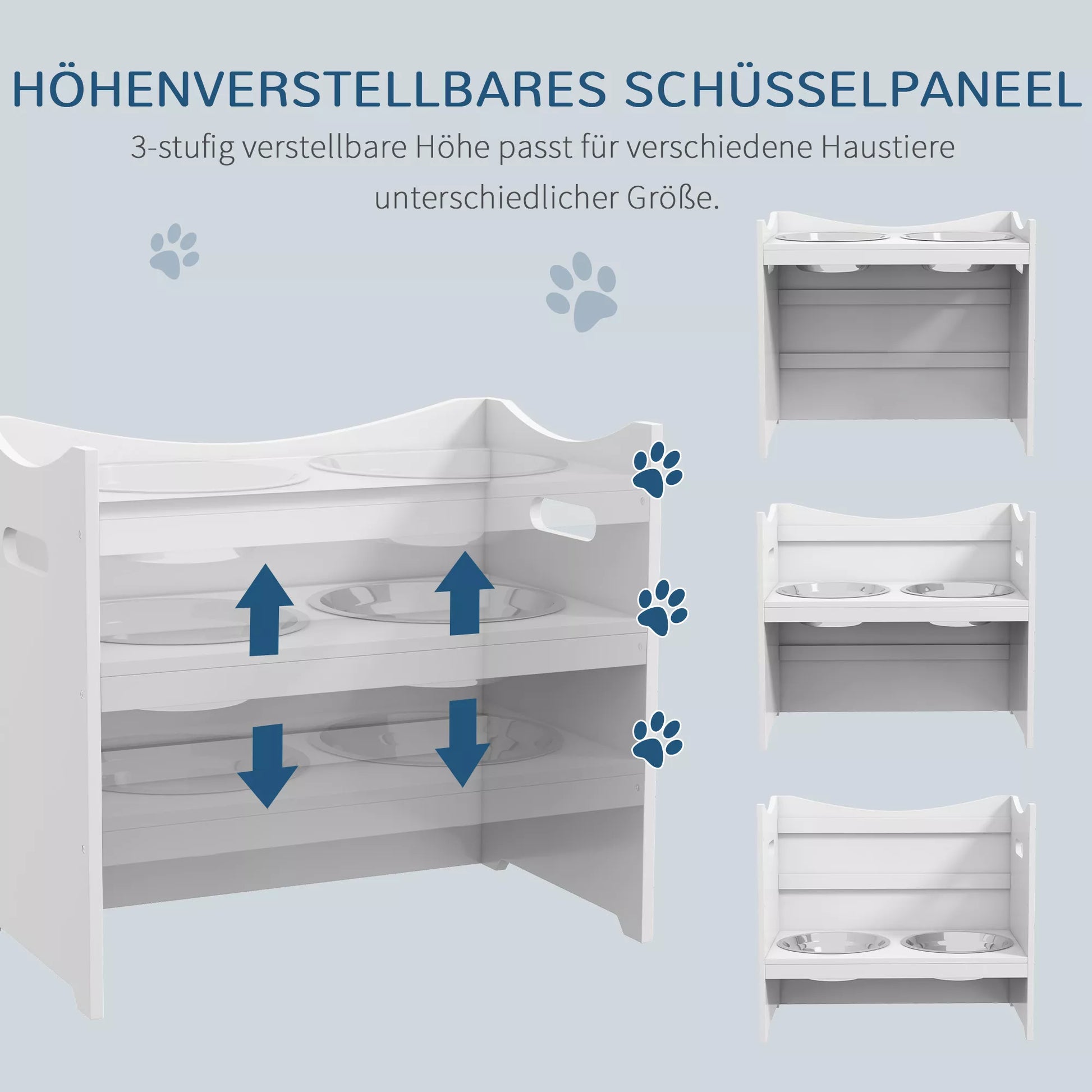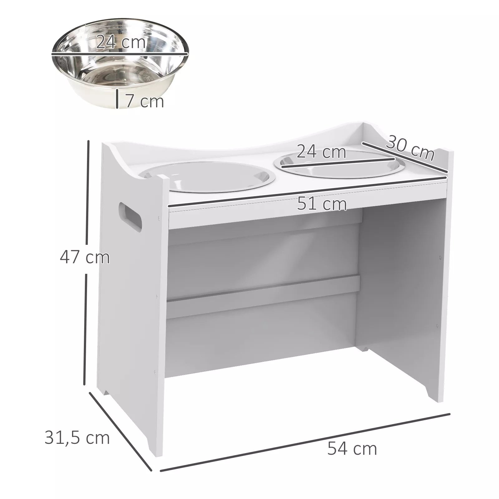 Maisto stotelė šunims, 2 nerūdijančio plieno dubenėliai, reguliuojamo aukščio, 54x31,5x47cm, balta