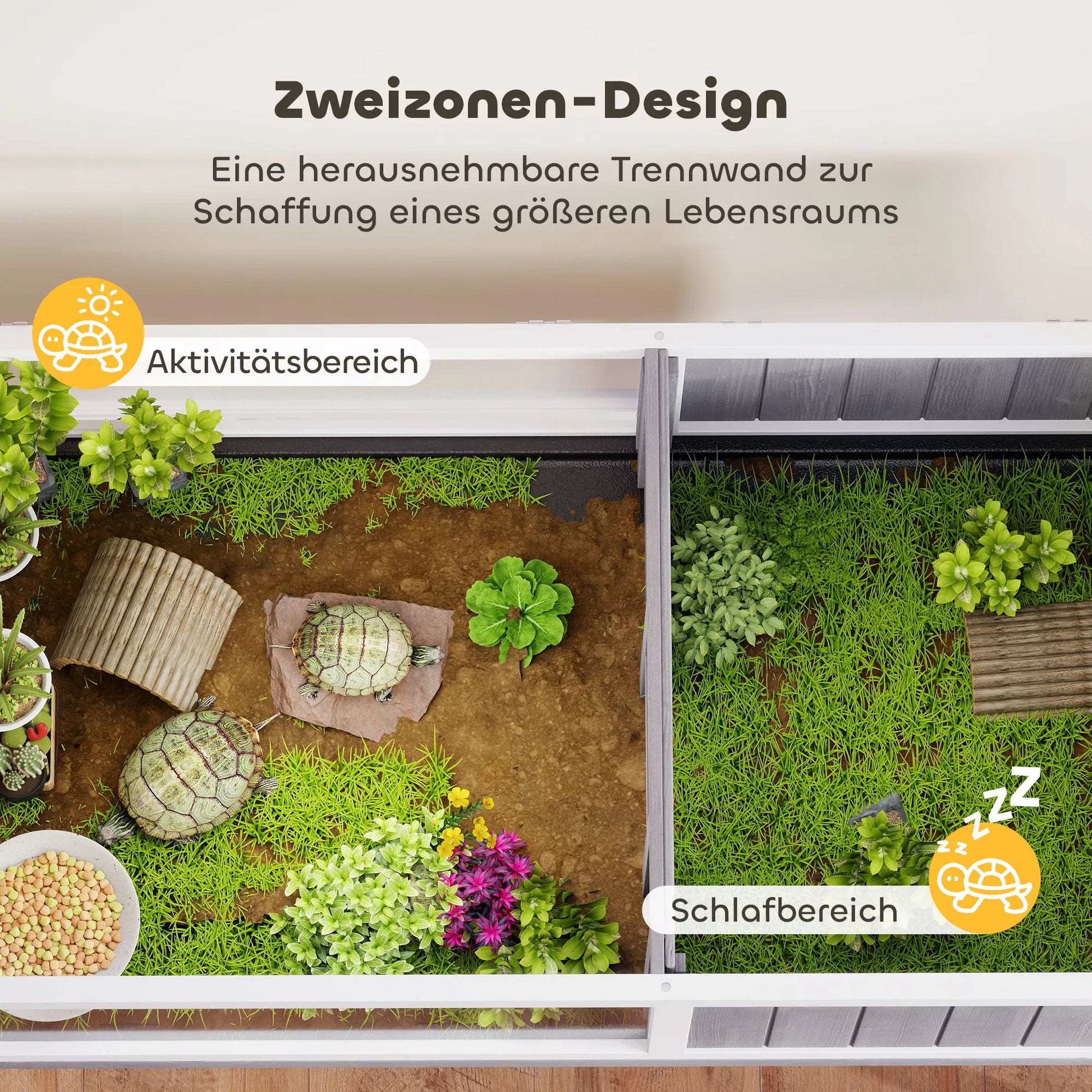 - ✔ Išimama pertvara leidžia sukurti dviejų zonų arba didelę, pritaikomą buveinę