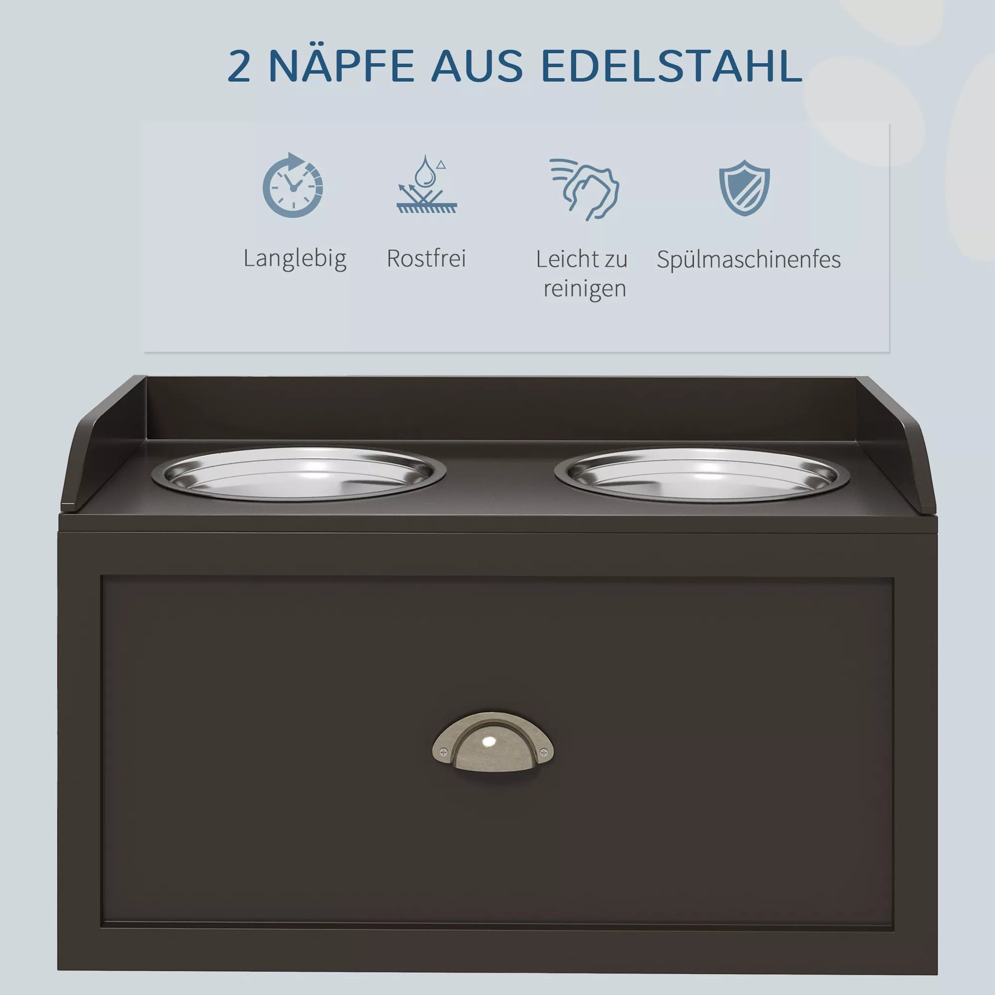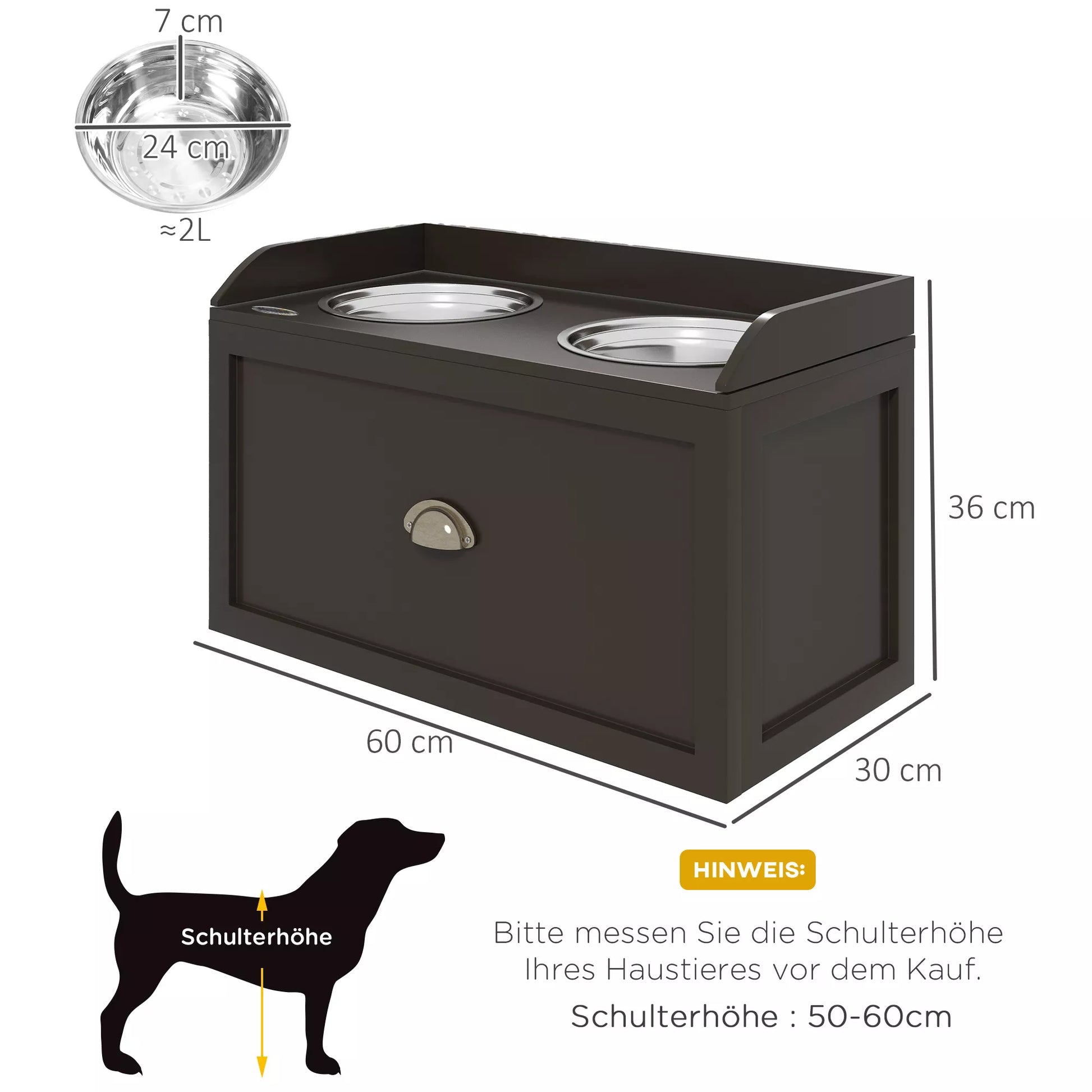 Paaukštinta šėryklos stotelė su 2 dubenėliais, 2 nerūdijančio plieno dubenys, 1 daiktadėžė, 60 x 30 x 36 cm, ruda