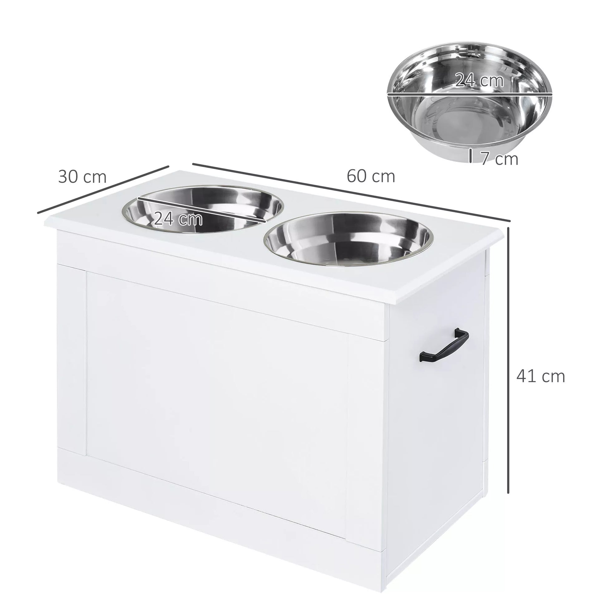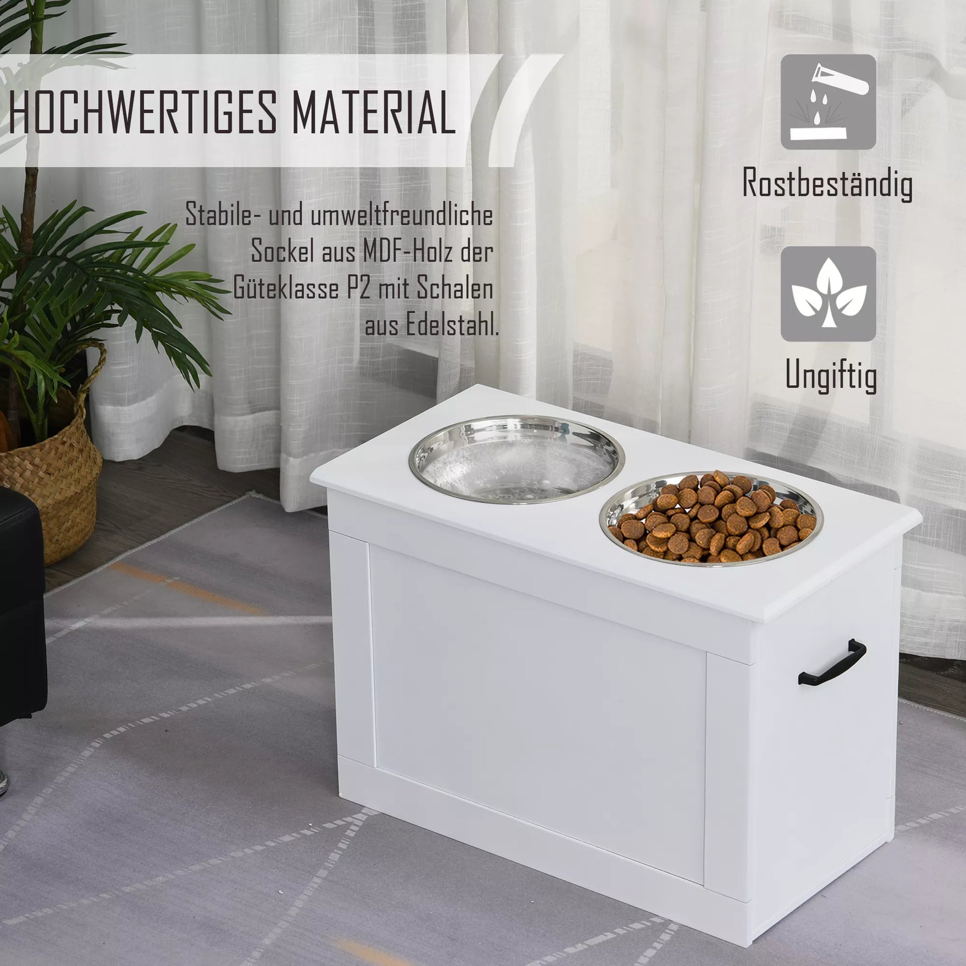 Šis paaukštintas dubenėlis augintiniui palengvina ir padaro patogesniu Jūsų augintinio maisto laiką. Komplekte yra du dubenėliai – vienas maistui ir vienas vandeniui. Abu galima lengvai išimti valymui. Taip pat yra daiktadėžė, pakėlus dangtį – puikiai tinka patogiai laikyti maistą. Tinka didesniems ir vyresniems šunims, kuriems sunku pasilenkti prie žemės.