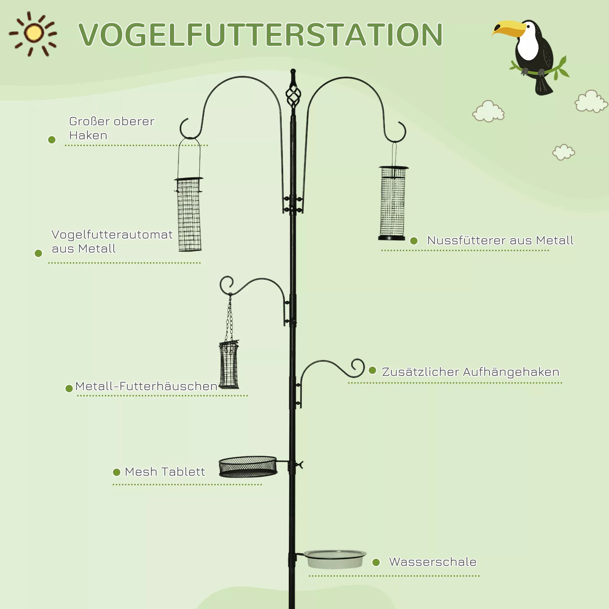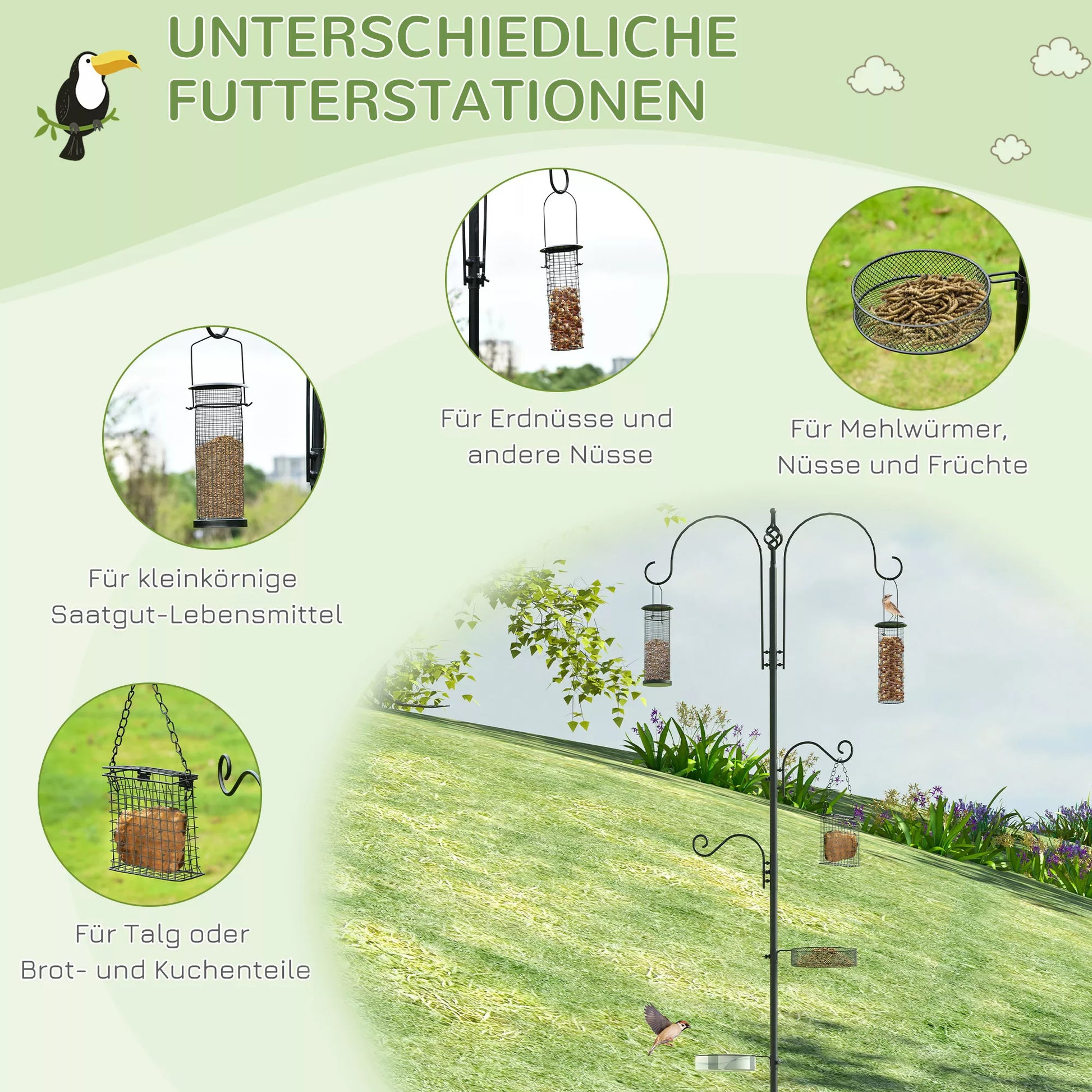 Paukščių lesyklos rinkinys iš plieno, aukštis 208 cm, su 4 kabliukais, paukščių girdykla, lesinimo lėkštė, pilnas lesalų stulpas, lesyklos stotis, juoda