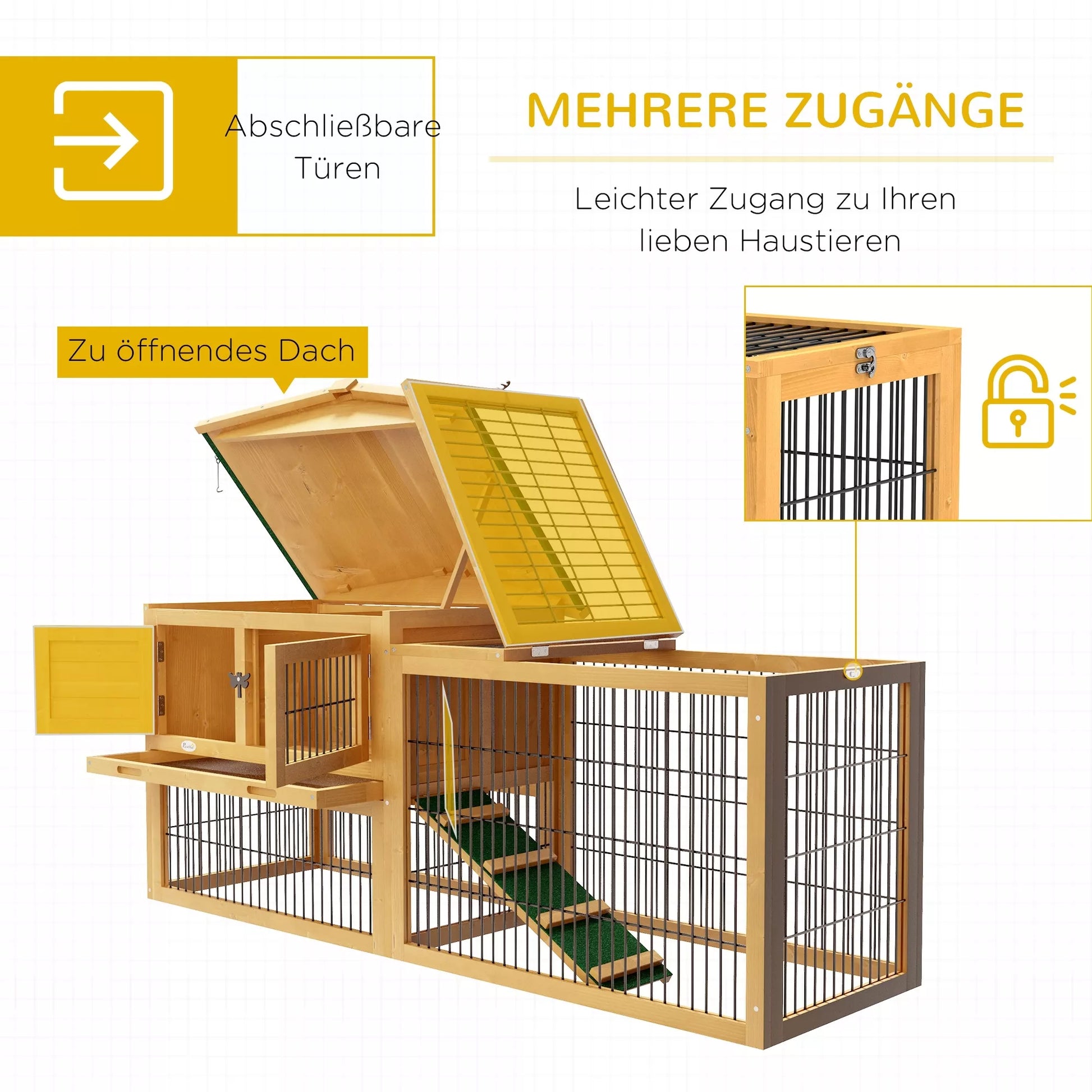 PawHut Dviaukštis triušių narvas su lauko aptvaru ir rampe, 2 aukštų, eglės mediena, atsparus žiemos sąlygoms, 150x52x68 cm, geltonas PawHut
