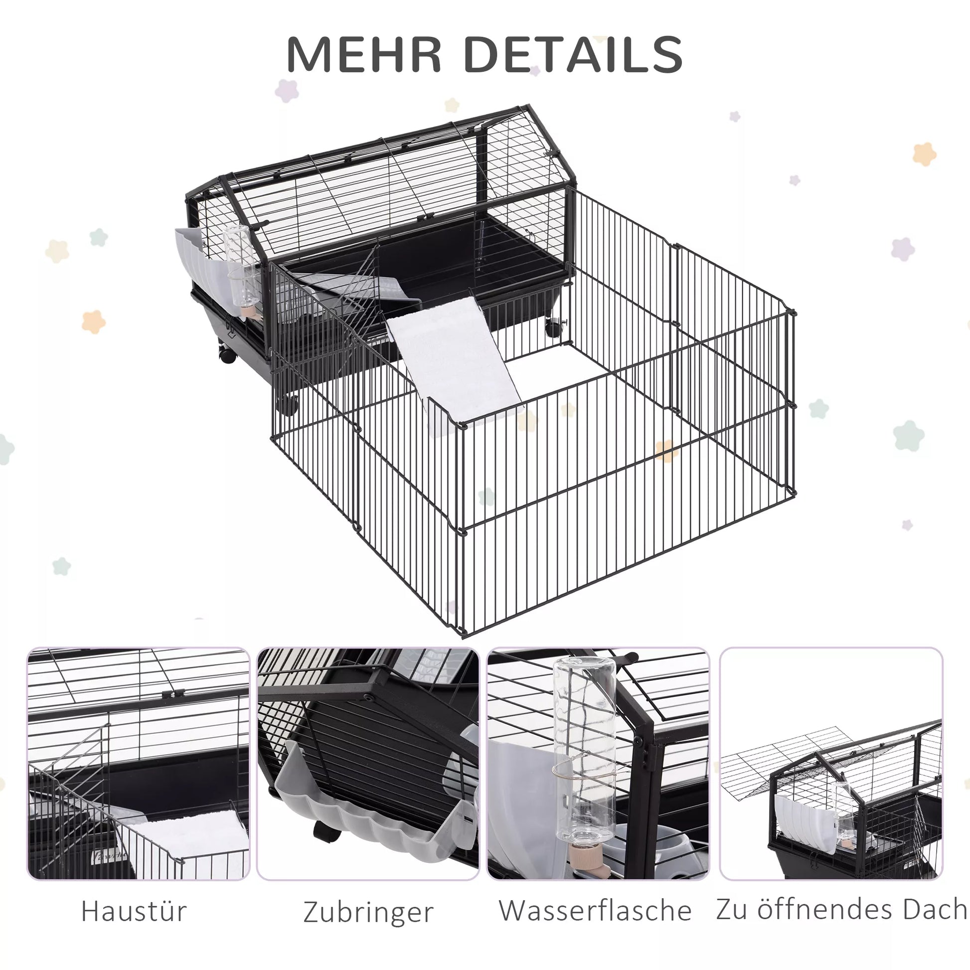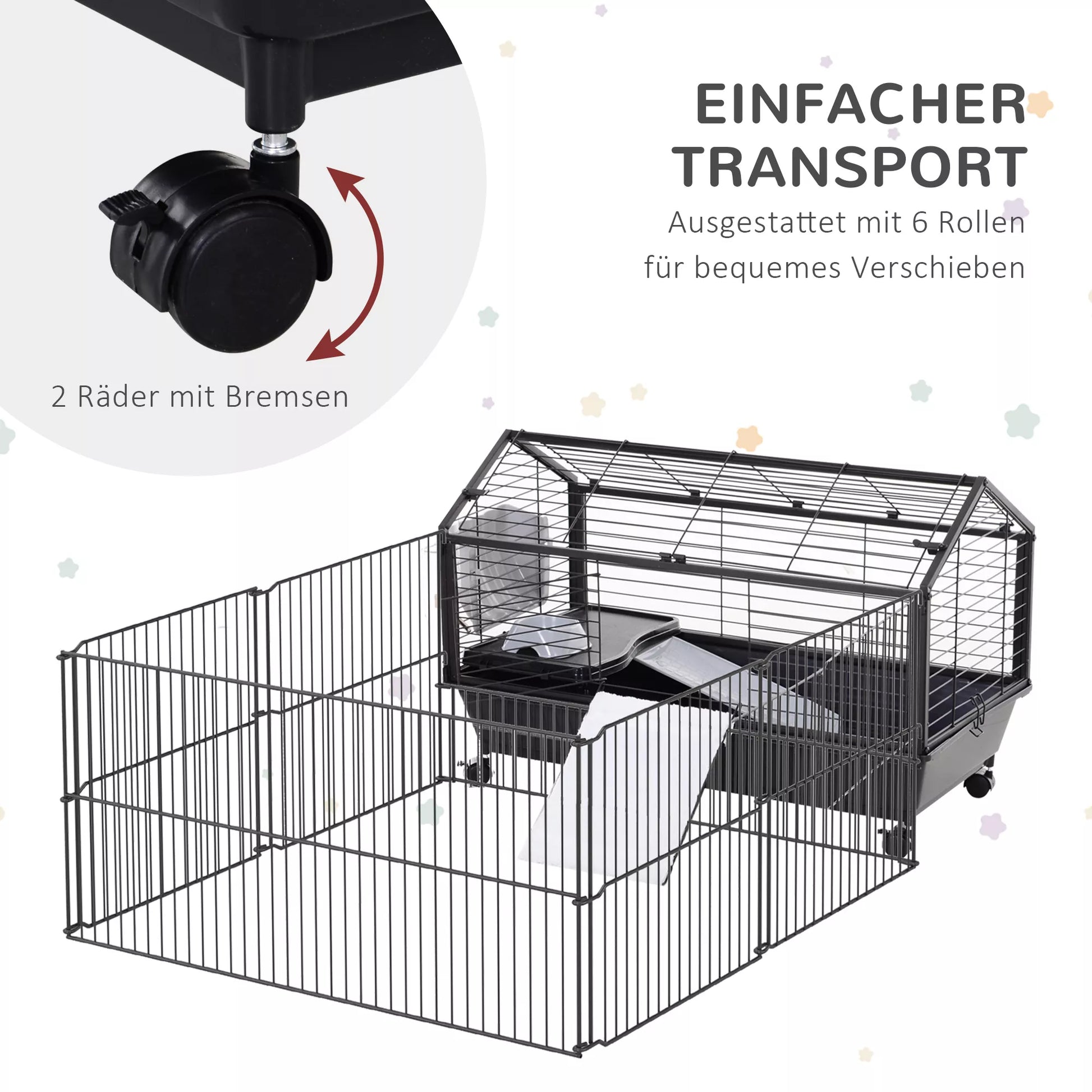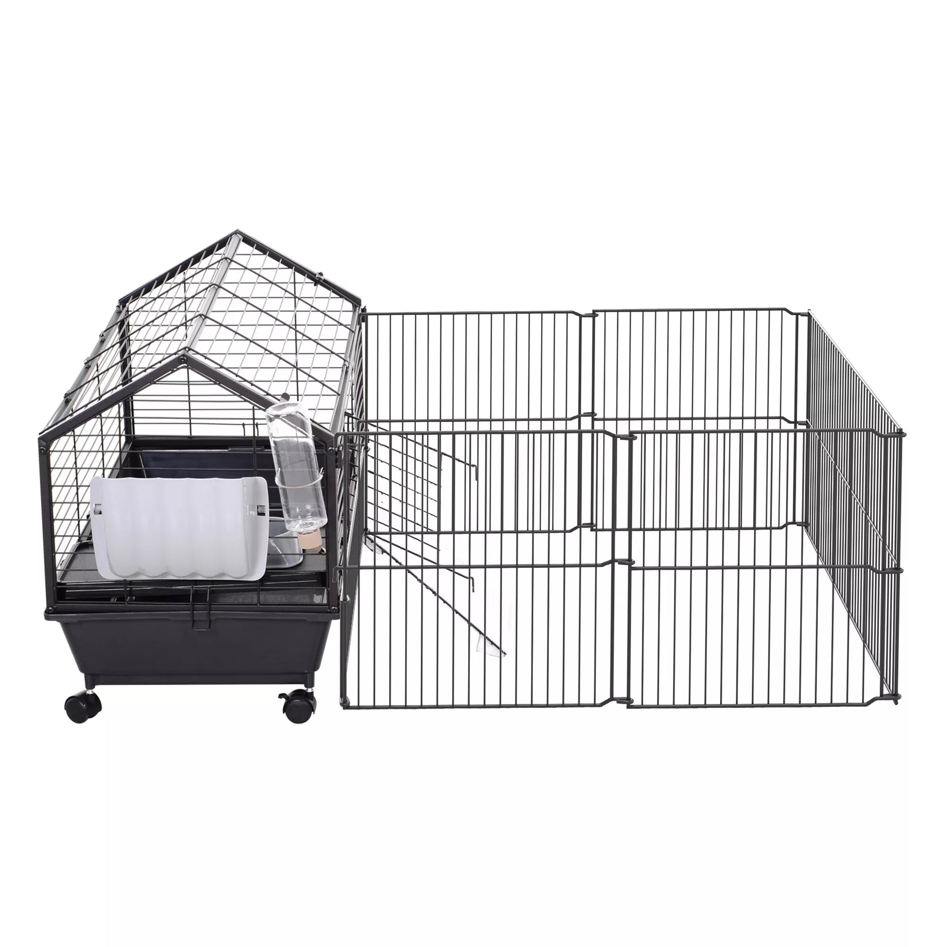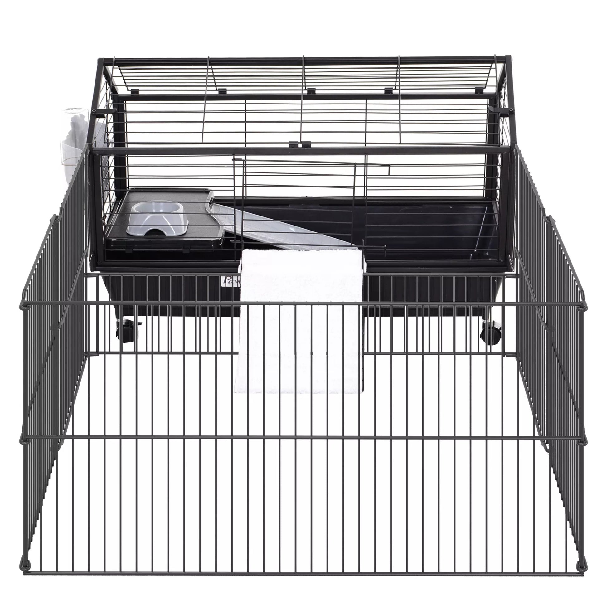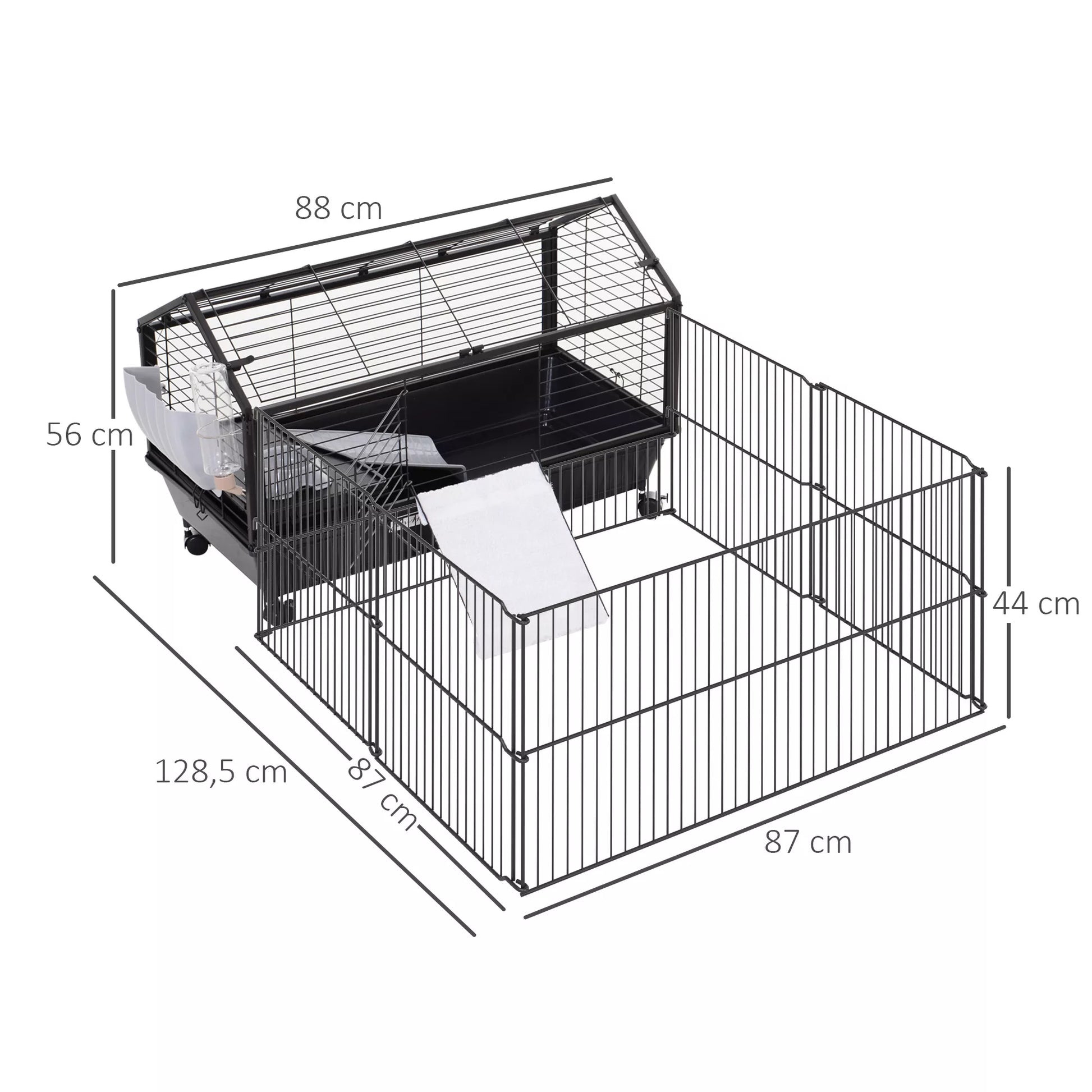 Pawhut Smulkių gyvūnėlių narvas su lauko aptvaru ir priedais, 88 cm x 128,5 cm x 56 cm, 4 ratukai, juodas, metalas, polipropilenas