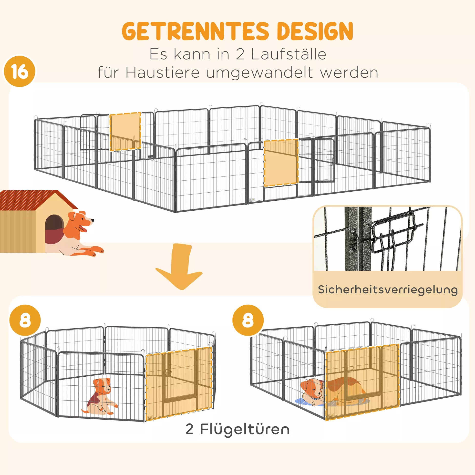Šis praktiškas PawHut aptvaras suteikia jūsų augintiniams daug saugios erdvės žaisti ir ilsėtis, neleisdamas jiems patekti į pavojų. Aptvaras susideda iš 16 segmentų, kuriuos galima laisvai kombinuoti ir pritaikyti prie jūsų aplinkos. Dvi užrakinamos durys suteikia lengvą prieigą ir užtikrina jūsų gyvūnų saugumą. Pagamintas iš tvirto metalinio rėmo ir tinklo, aptvarą galima naudoti tiek viduje, tiek lauke.