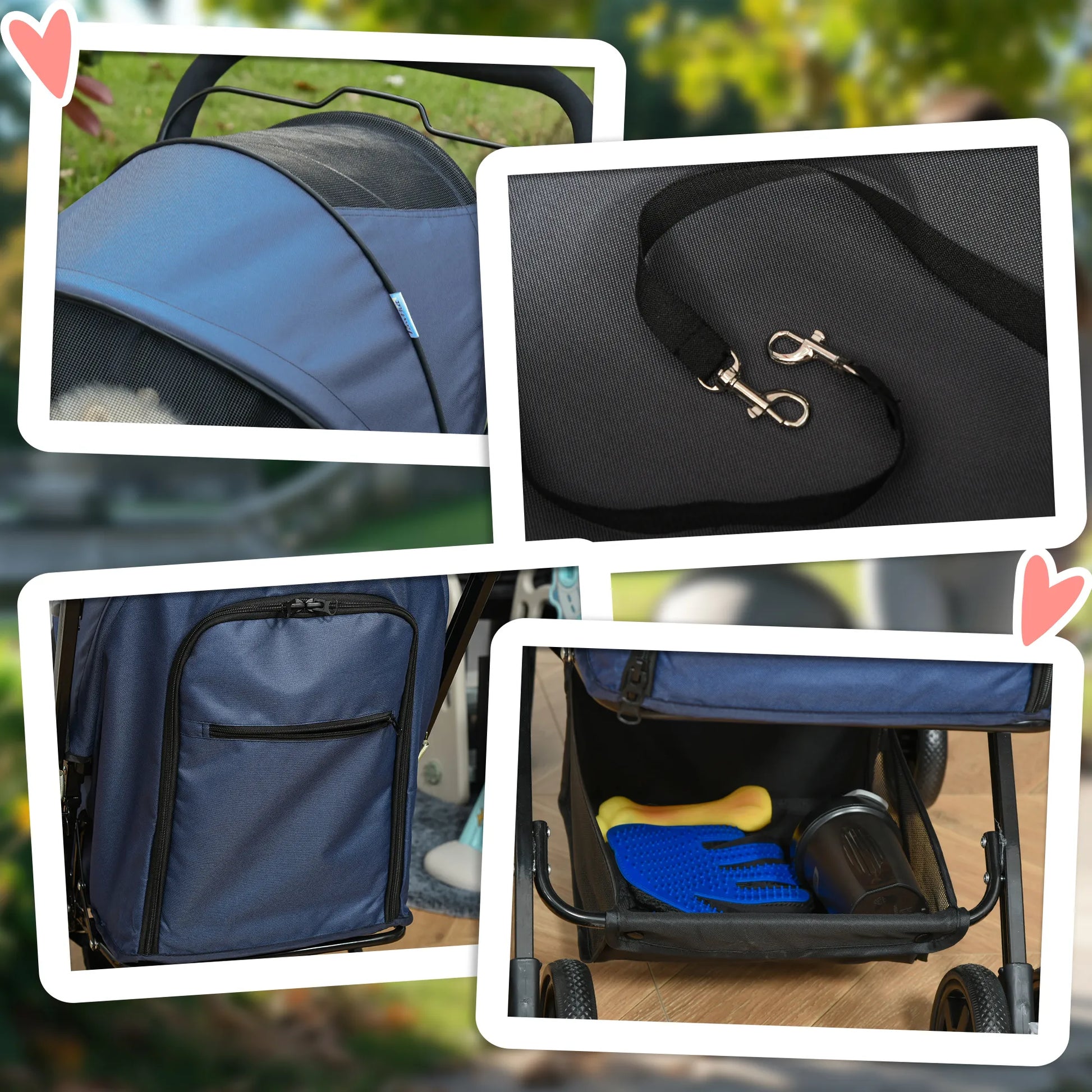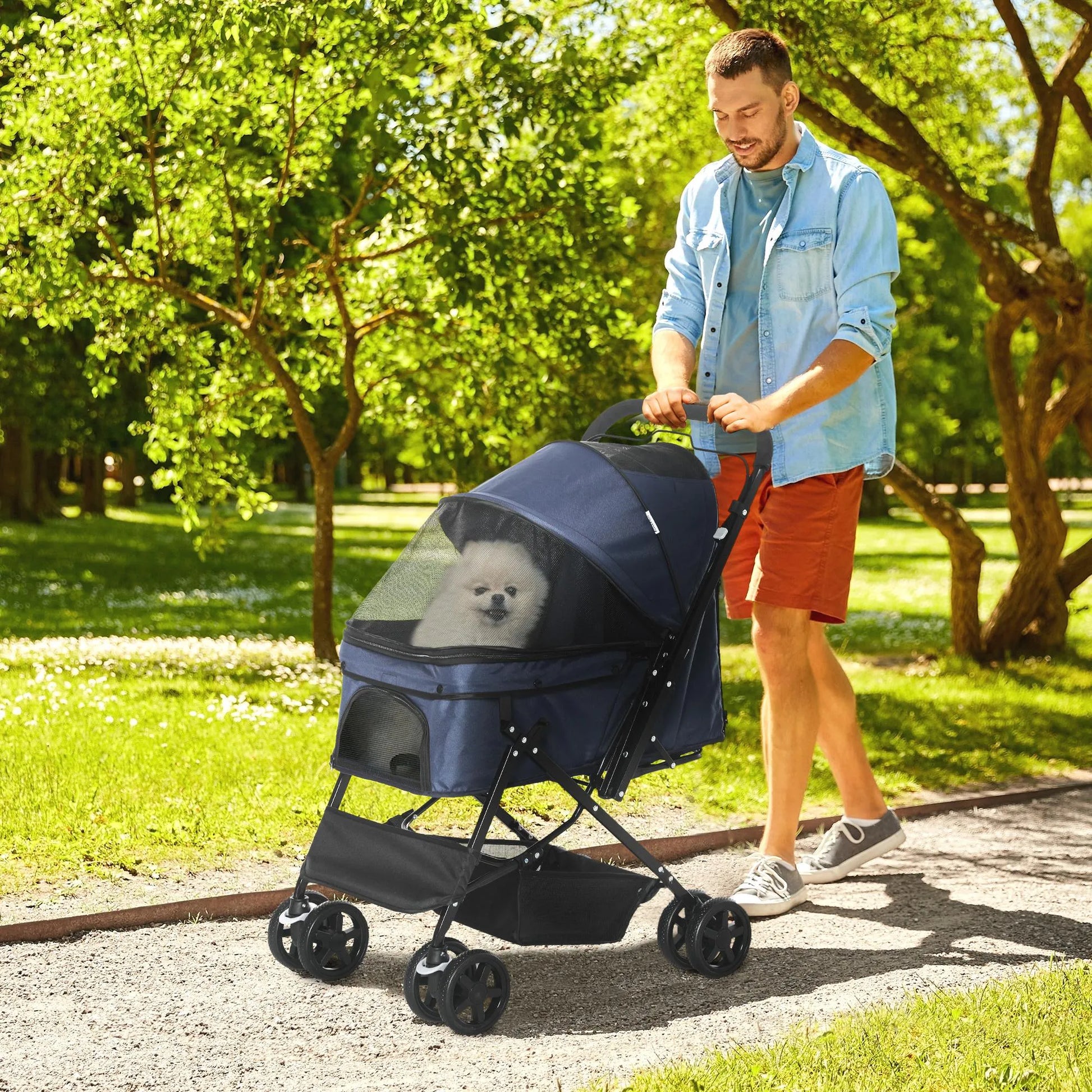 PawHut šunų vežimėlis iki 10 kg, reguliuojamas stogelis, sulankstomas, krepšys daiktams, 2 stabdžiai, saugos pavadėlis, Mėlynas