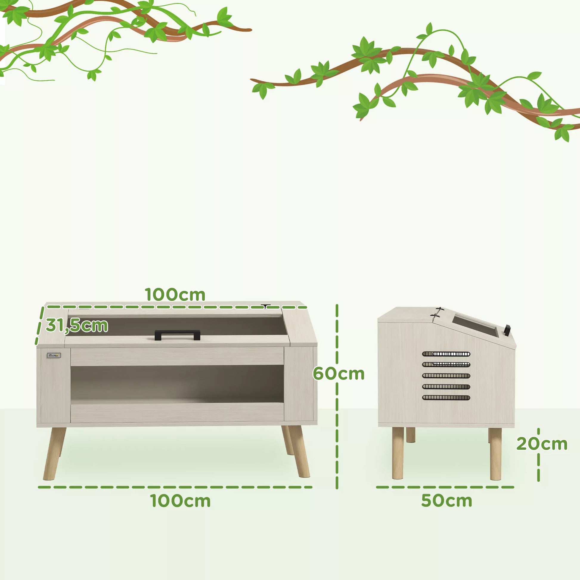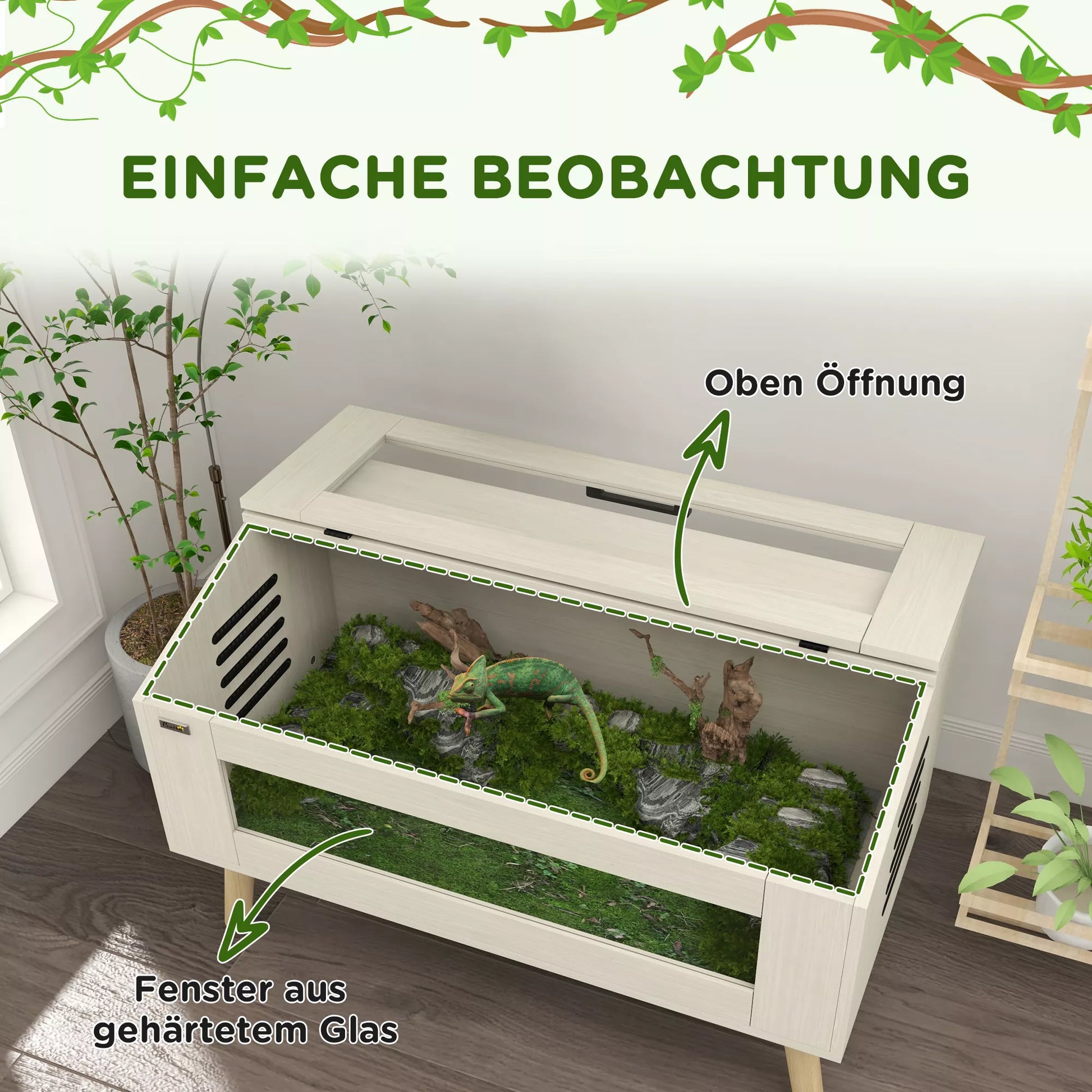 Atraskite elegantišką roplių dėžę: 140 litrų rojus driežams, rupūžėms ir kitiems ropliams. Viršutinis atidarymas ir saugaus stiklo langai leidžia stebėti jūsų gyvūnus. 10 ventiliacijos angų garantuoja optimalų oro pritekėjimą. Dugnoje yra vietos šildymo kilimėliui sukurti idealią temperatūrą – tai tobula namų aplinka, kurioje jūsų augintiniai puikiai jausis.