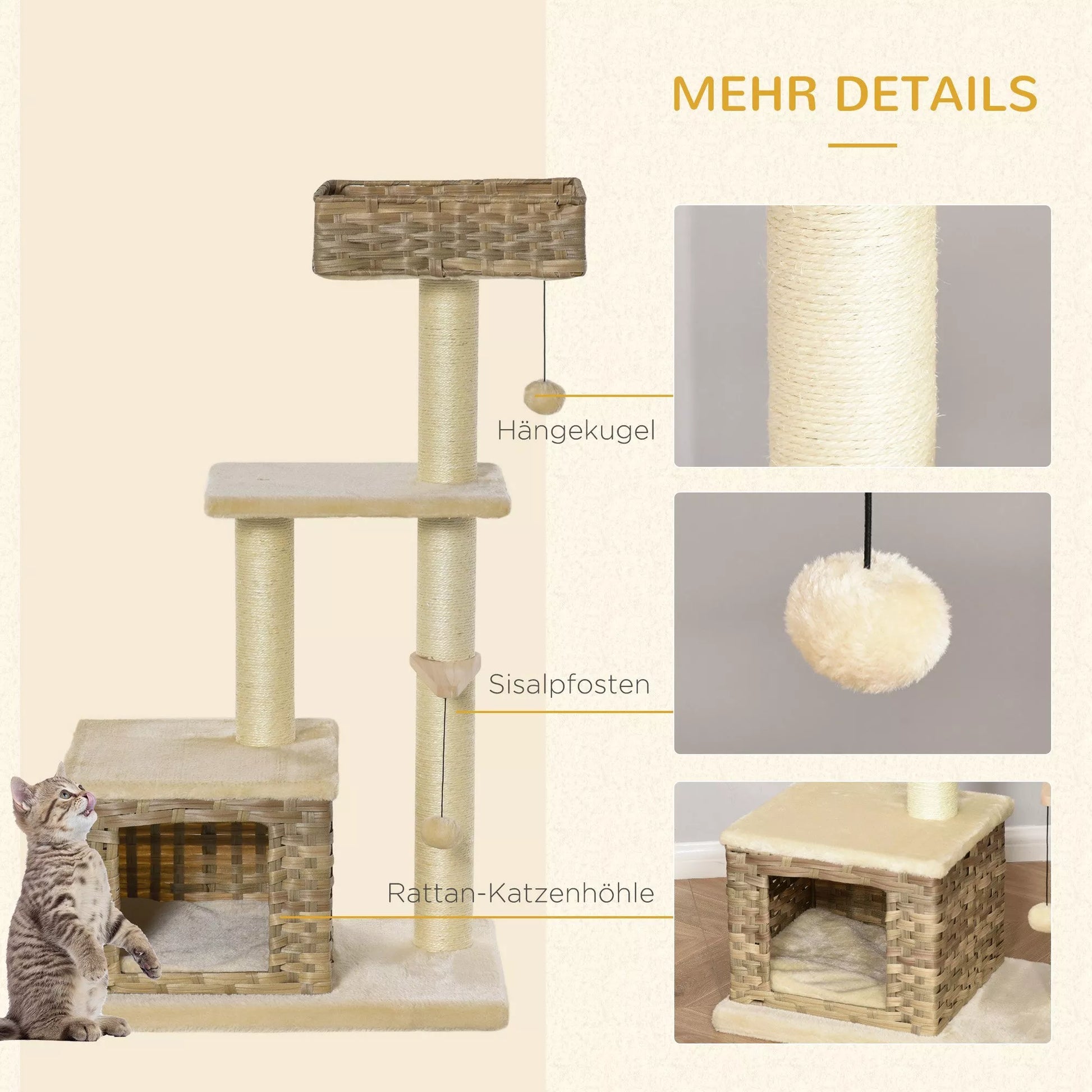 Rotango katės medis, kačių draskyklė, baldai kačiukams su būdele, kamuoliuko žaislas, sizalis, minkštas pliušas, PE, aukštis 108 cm, ruda+smėlio