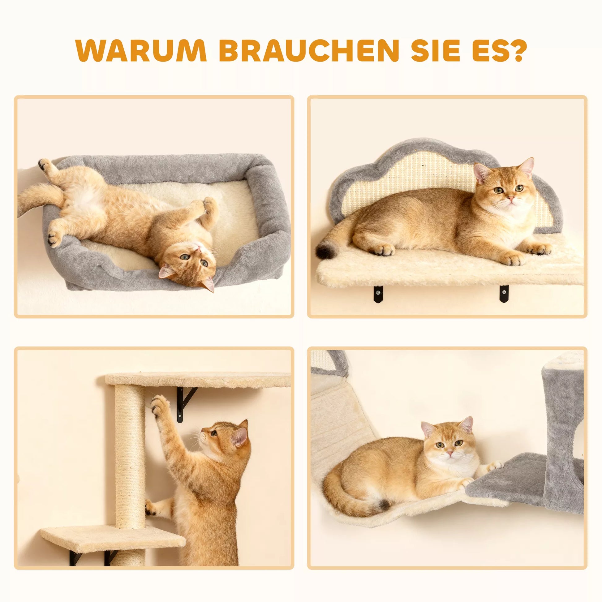 Eilgins, kad trūksta vietos jūsų katės laimei? Per daug daiktų namuose kelia nerimą jums ir jūsų katei. Katės sienelės laipiojimo komplektas jūsų sieną pavers saugia, daugiasluoksne žaidimų aikštele. Šis tvirtas 4-in-1 komplektas sukuria jau kampelį laipiojimui ir poilsiui, atlaisvina jūsų svetainę ir praturtina jūsų katės gyvenimą.