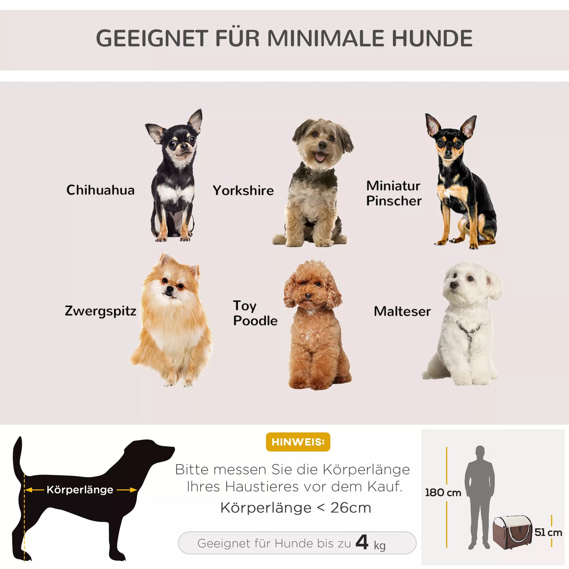 • ✔ tinka miniatiūriniams šunims, kurių kūno ilgis mažesnis nei 26 cm, o svoris mažesnis nei 4 kg