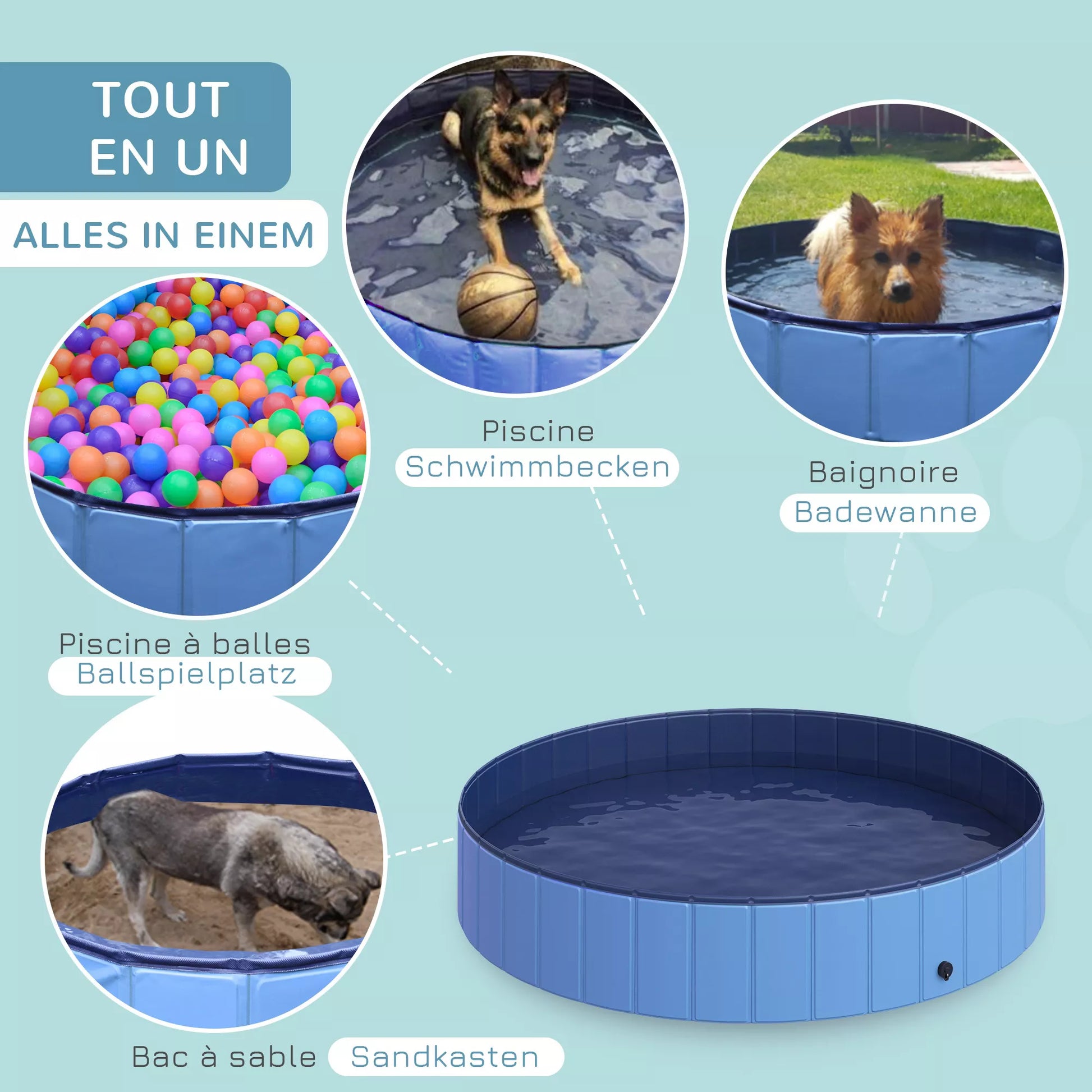 Idealiai tinka atvėsti karštomis dienomis! Plaukimas šunų baseine yra sveika ir atvėsina. Gali būti naudojamas naminiams gyvūnams atvėsti karštomis, saulėtomis dienomis. Dėka šunų baseino, jūsų augintinis turės daug linksmybių ir džiaugsmo.