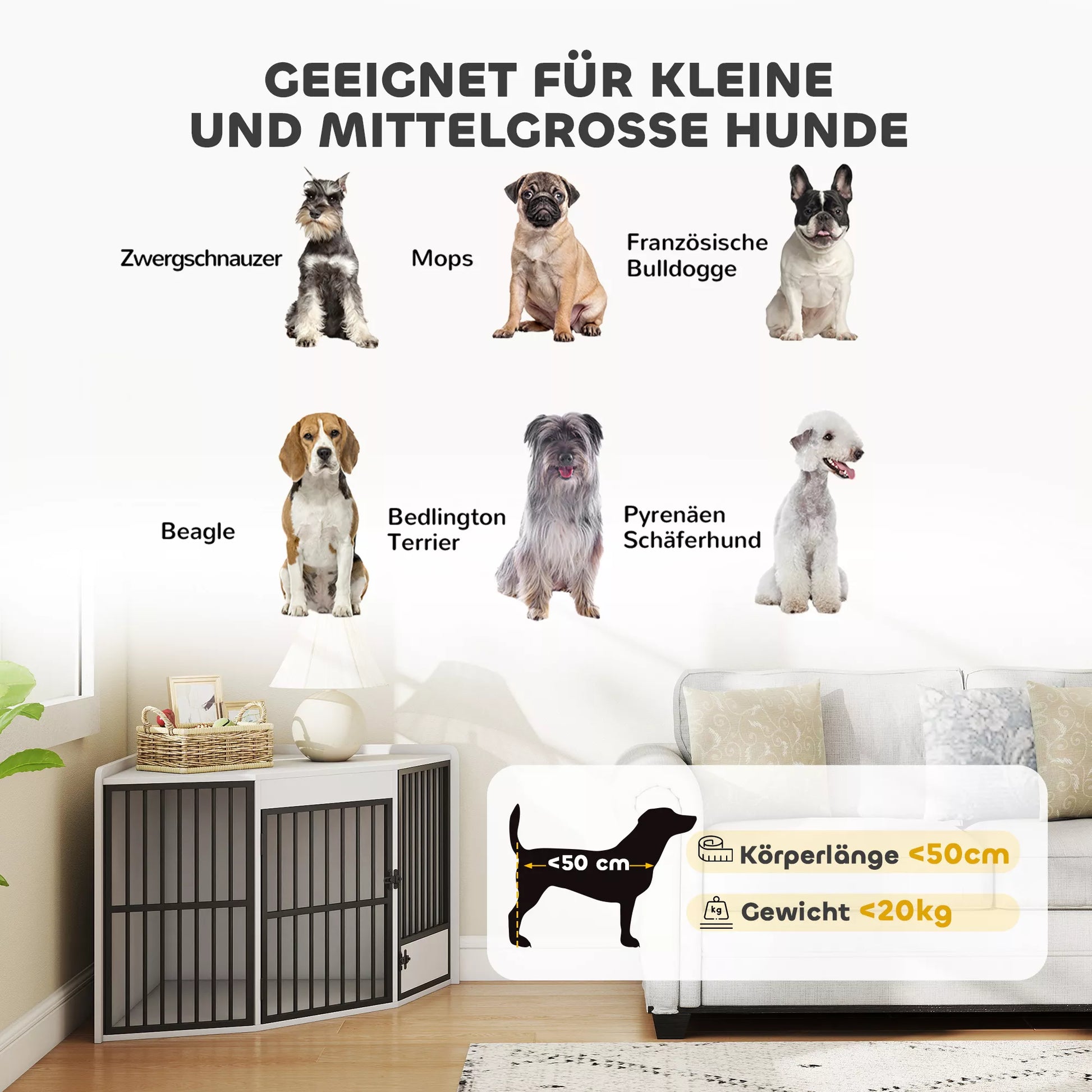 Šunų dėžė, laikymo erdvė mažiesiems ir vidutinio dydžio šunims, gyvūnų laikymo dėžė, maitinimo durelės, MDF, metalas, balta