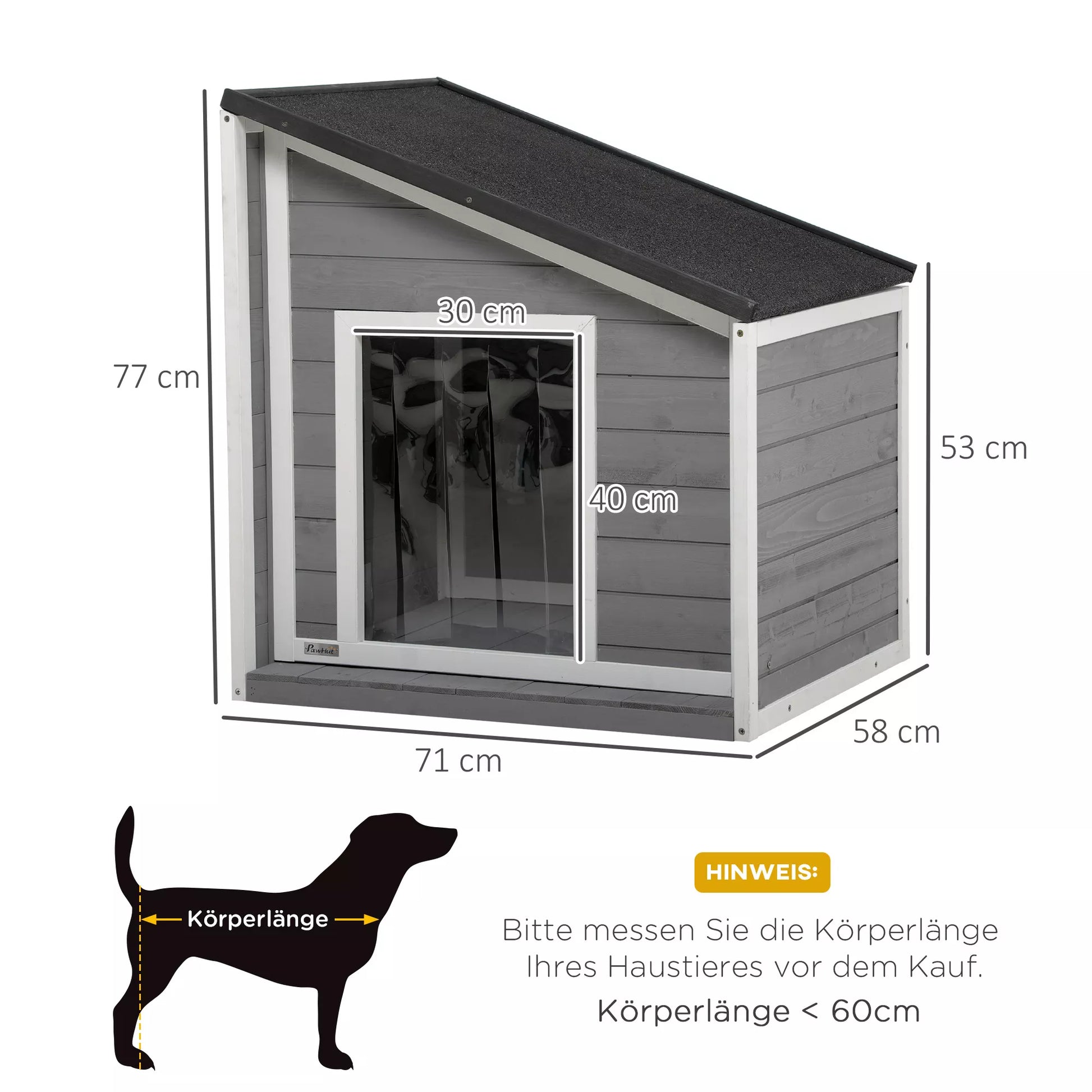 Šunų namelis iš masyvmedžio, atsparus oro sąlygoms, su asfaltiniu stogu, 71 cm x 58 cm x 77 cm, Pilka + Balta
