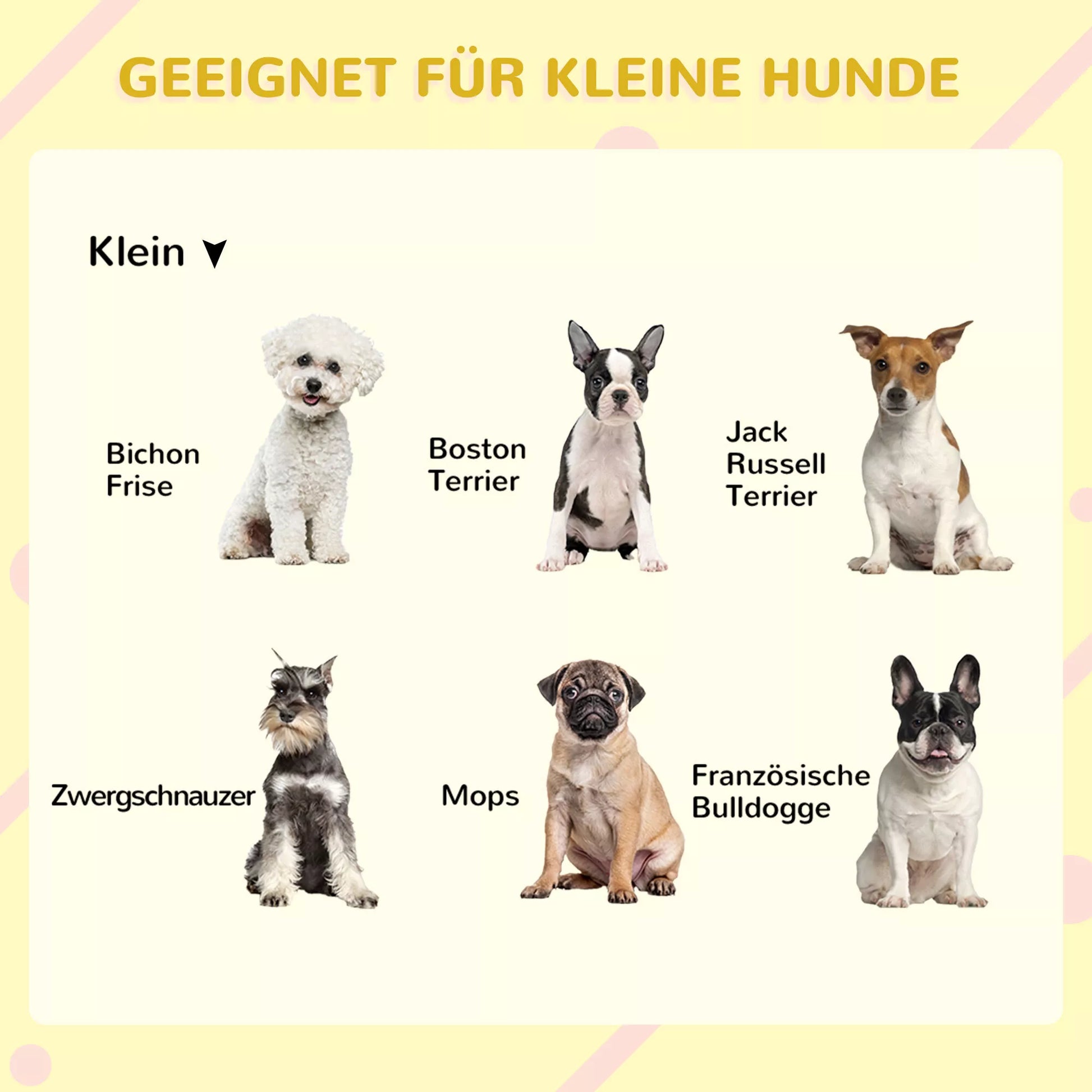 • ✔ Tinka mažiems šunims iki 15 kg ir 60 cm ūgio, tokiems kaip prancūzų buldogai ir taksai