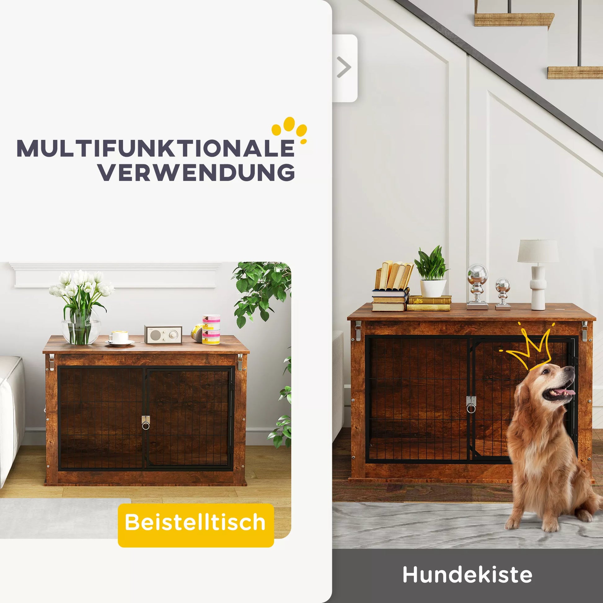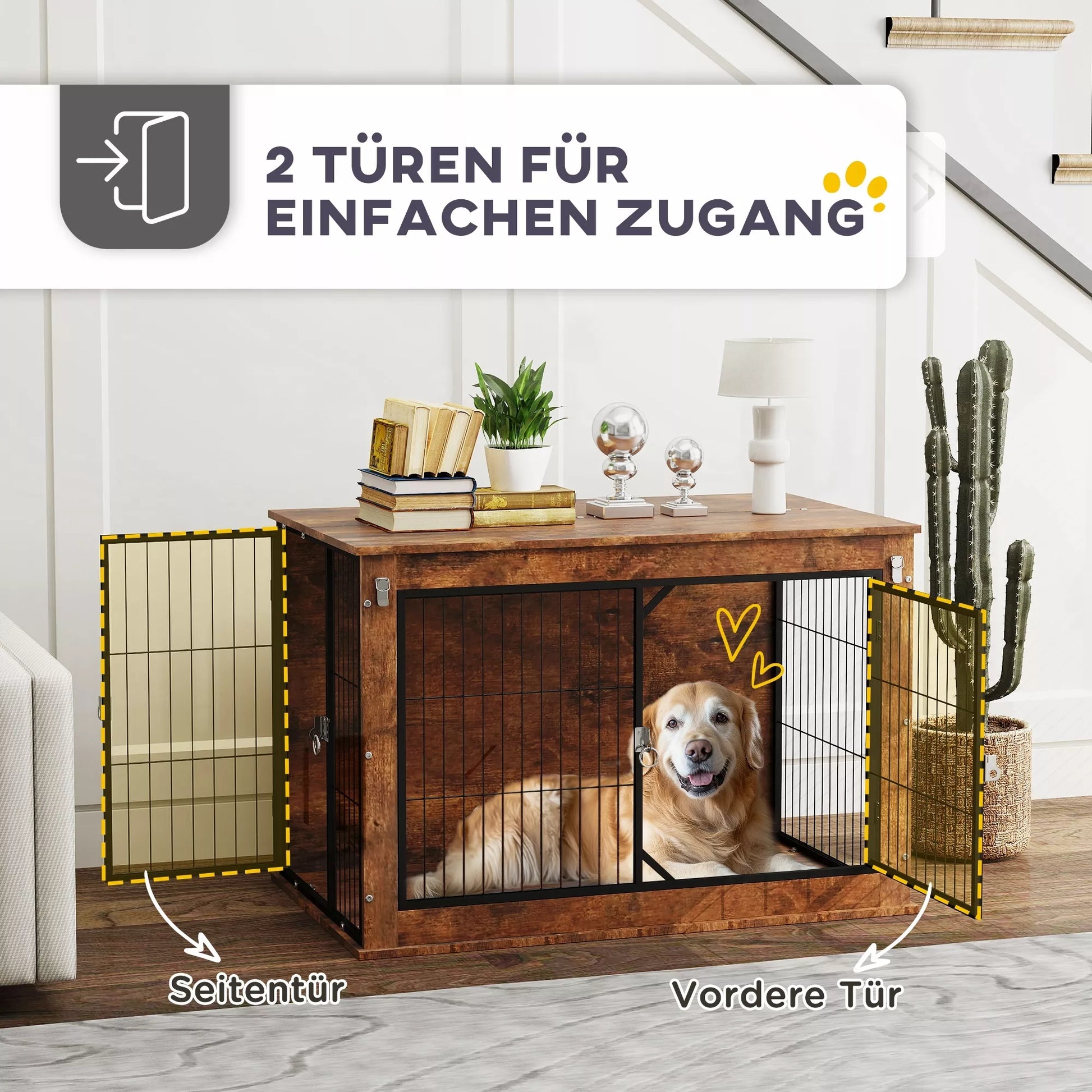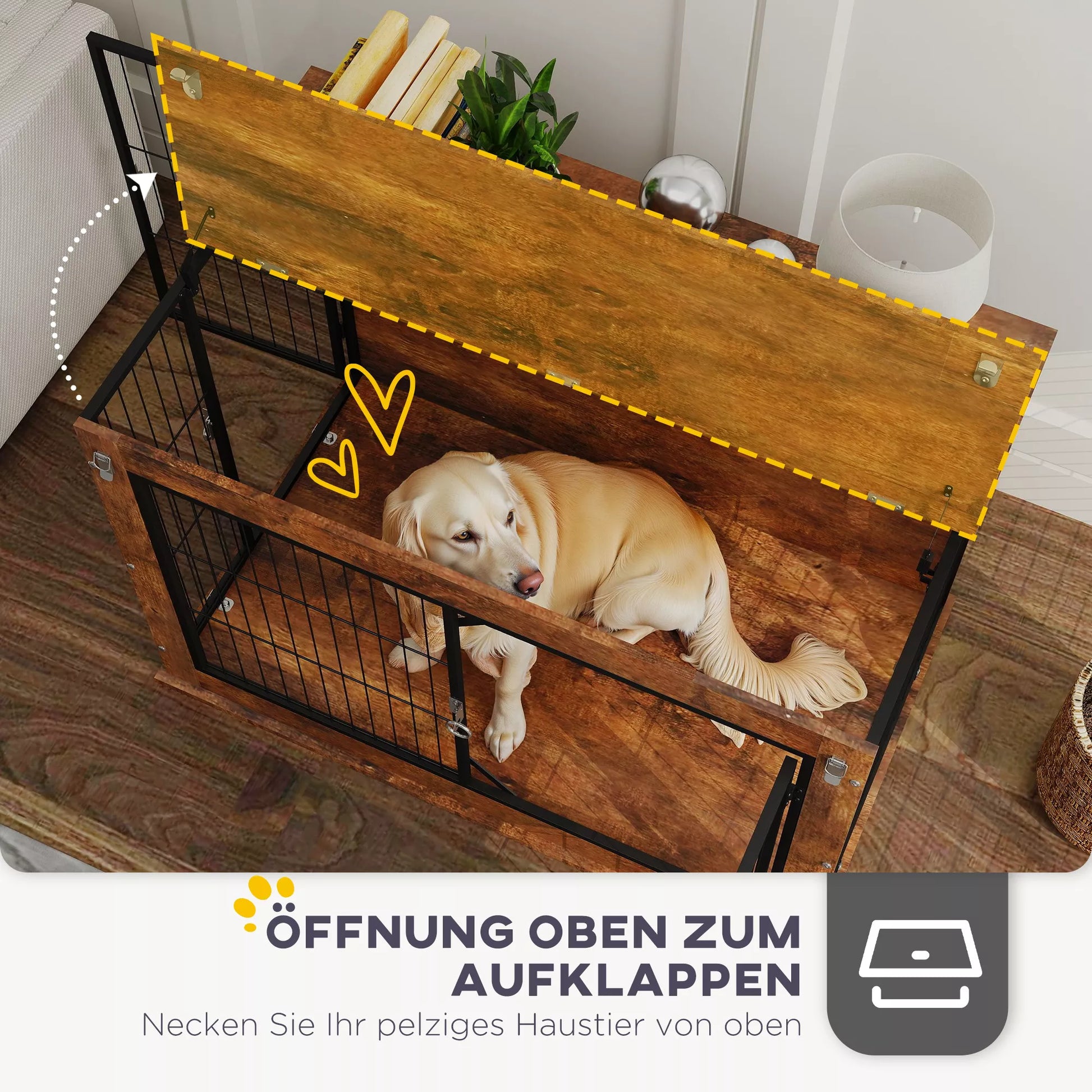 Patirkite namų interjerui skirtos šunų dėžės privalumus: stilinga ir saugi. Viršutinė šunų narvo namams anga palengvina jūsų šuns raminimą keliaujant, o dvi durys su saugiais užraktais ir vėdinimu iš trijų pusių užtikrina patogumą ir gerą prieinamumą. Puikiai tinka ir dideliems šunims, kaip poilsio vieta namuose arba kaip transportavimo dėžė kelionėms.
