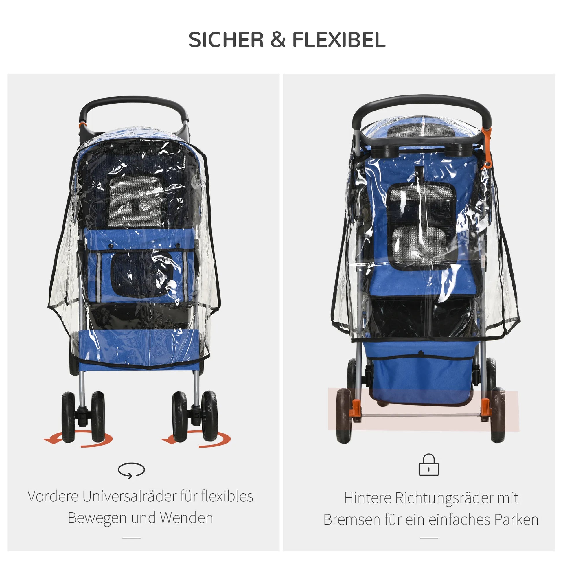 Šunų vežimėlis iki 10 kg, sulankstomas, su apsauga nuo lietaus, apatiniu krepšiu, 2 puodelių laikikliais, 75 cm x 45 cm x 97 cm, mėlynas