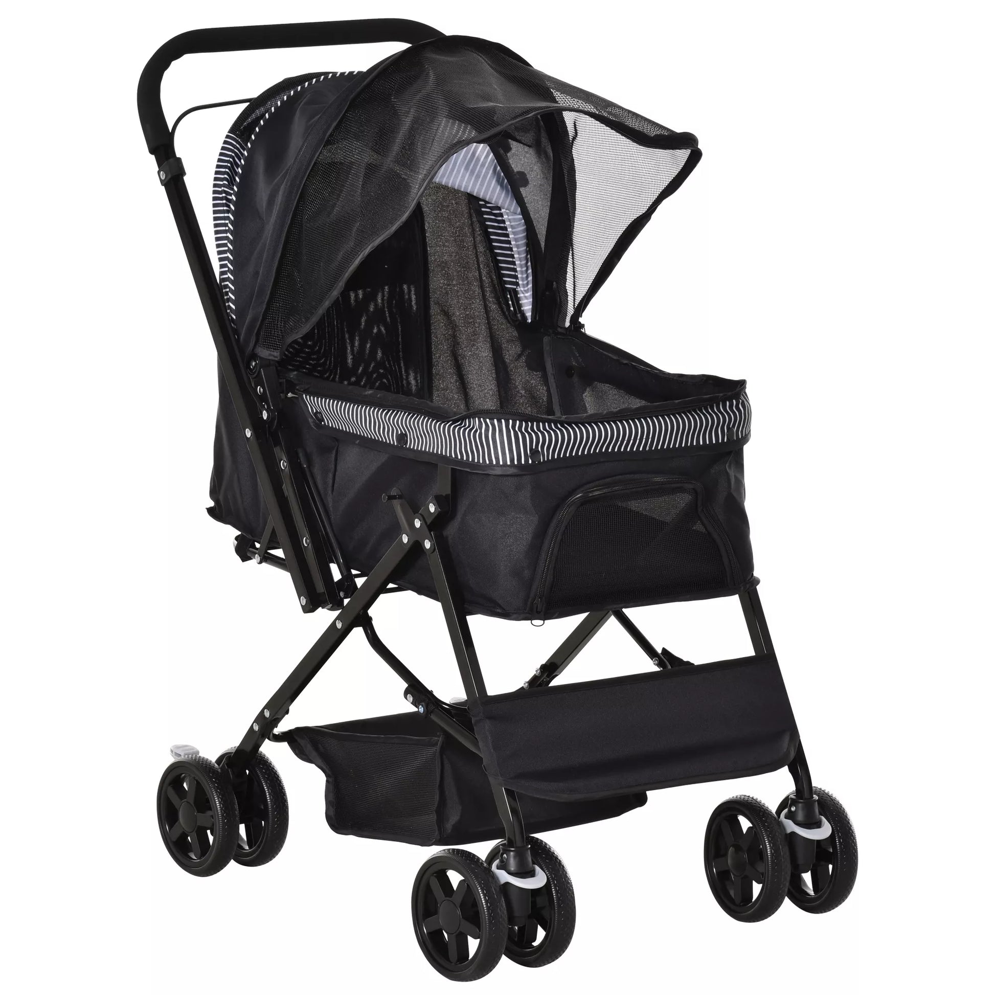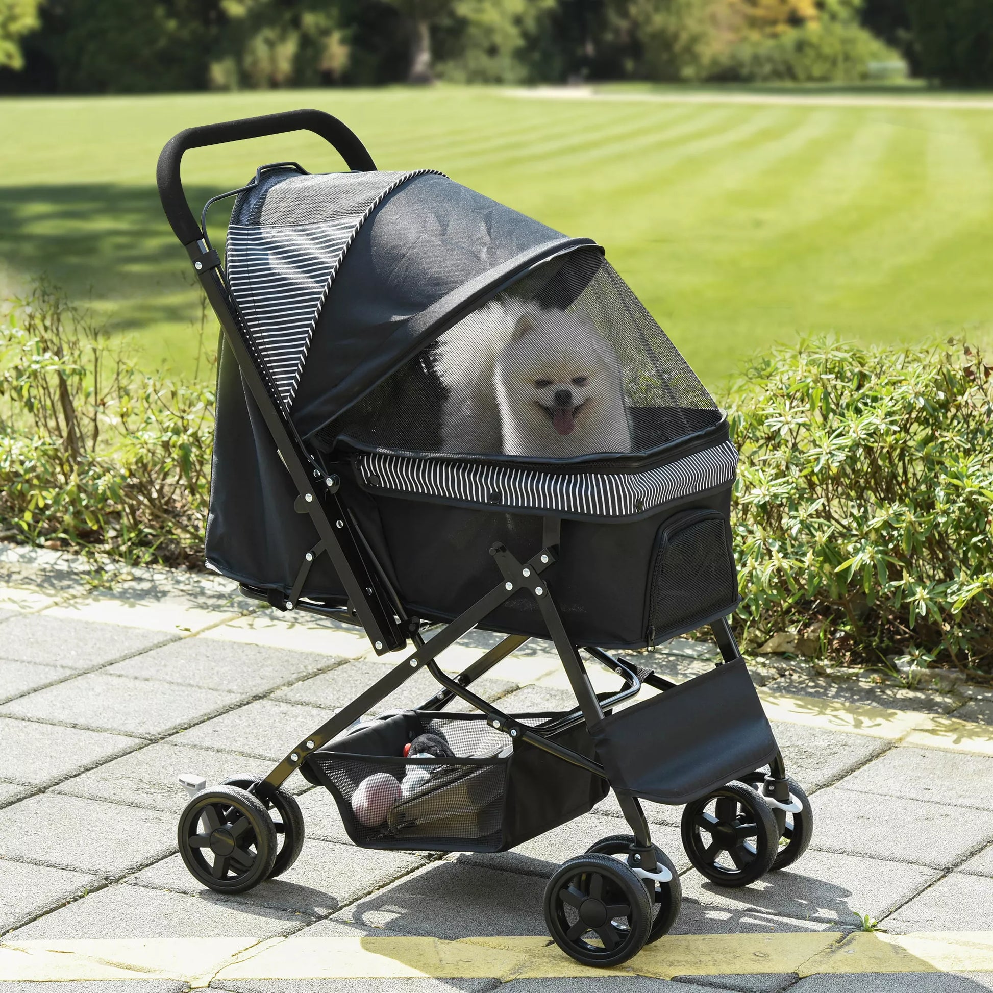 Su šiuo vežimėliu savo šunį galėsite saugiai transportuoti lauke. Jis turi lengvai riedančius ratus ir tvirtą rankeną, todėl jį lengva pasiimti su savimi. Viršutinis krepšys yra erdvus, todėl jūsų šuo viduje turės daug vietos. Rankena yra atverčiama, todėl jūsų šuo galės žiūrėti į jus arba į aplinką. Tinka mažoms veislėms, tokioms kaip Bišonas Frise ir Mopsas.
