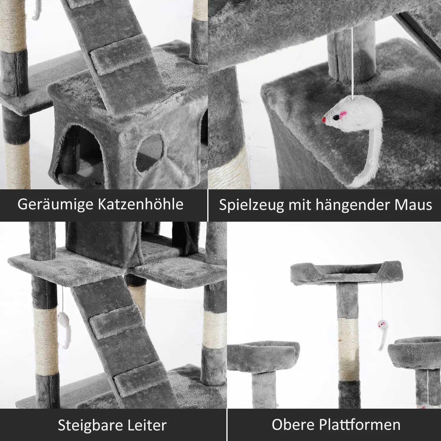 Šis didelis daugiaaukštis draskykles jūsų katei siūlo įvairiausius būdus, kaip patenkinti jos žaidimo ir laipiojimo poreikius: kelios platformos ir kopėtėlės, daugybė draskymui skirtų paviršių ir įdomūs, svyruojantys žaislai. Du nameliai suteikia saugią vietą poilsiui. Dėmesio: Padėkite sunkų daiktą ant apatinio lygio arba pastatykite draskyklę į kampą, kad užtikrintumėte maksimalų stabilumą. Negalima purtyti, kitaip draskyklė gali apvirsti.